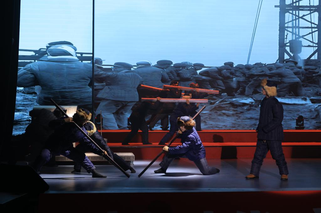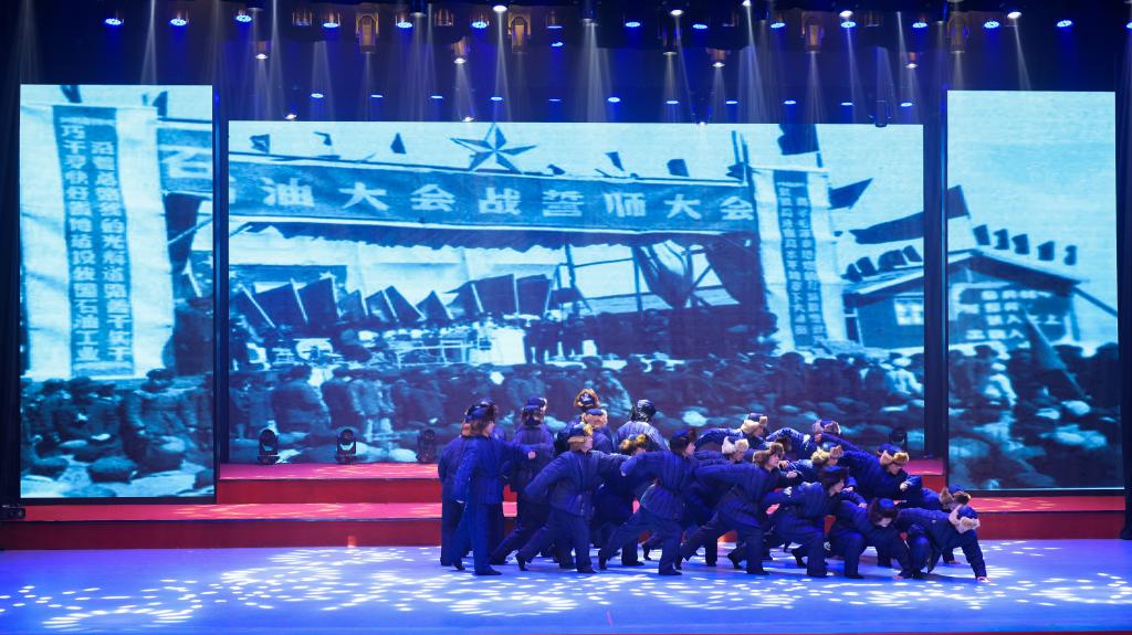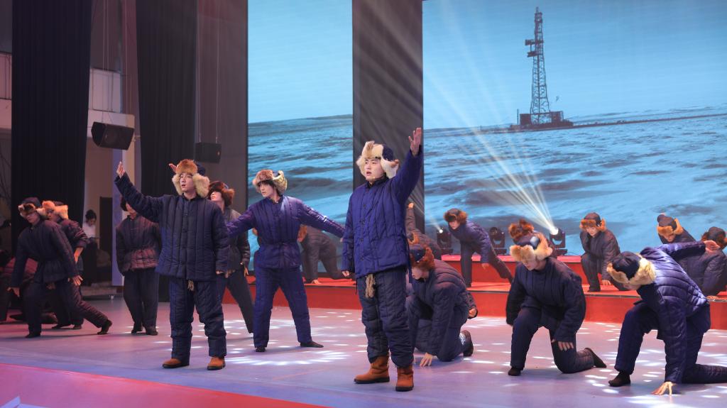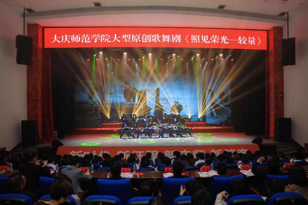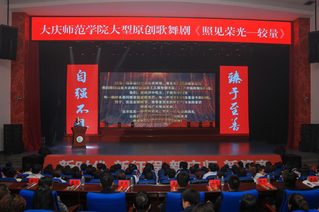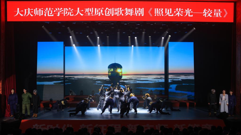 歌舞剧《照见荣光—较量》剧本取材大庆油田1960年代《战报》真人真事,勾勒会战工人英勇风貌,15首悠扬动听的原创歌曲,直击心灵的歌词以及戏剧化的情景表演,将现场的师生带回火热的会战年代,得以窥见大会战时期油田工人那坚韧不拔、勇于开拓的精神风貌。每一个音符、每一段舞蹈、每一声号子,都牵动着观众的思绪和情感,现场不时掌声雷动。