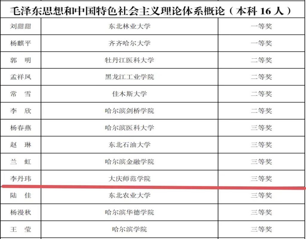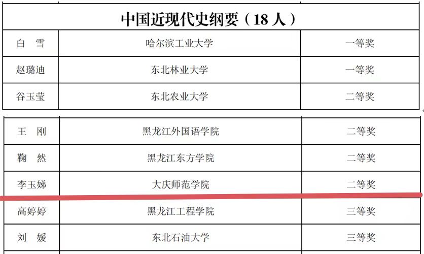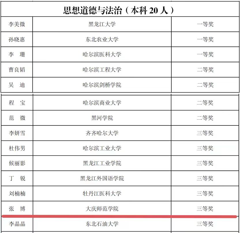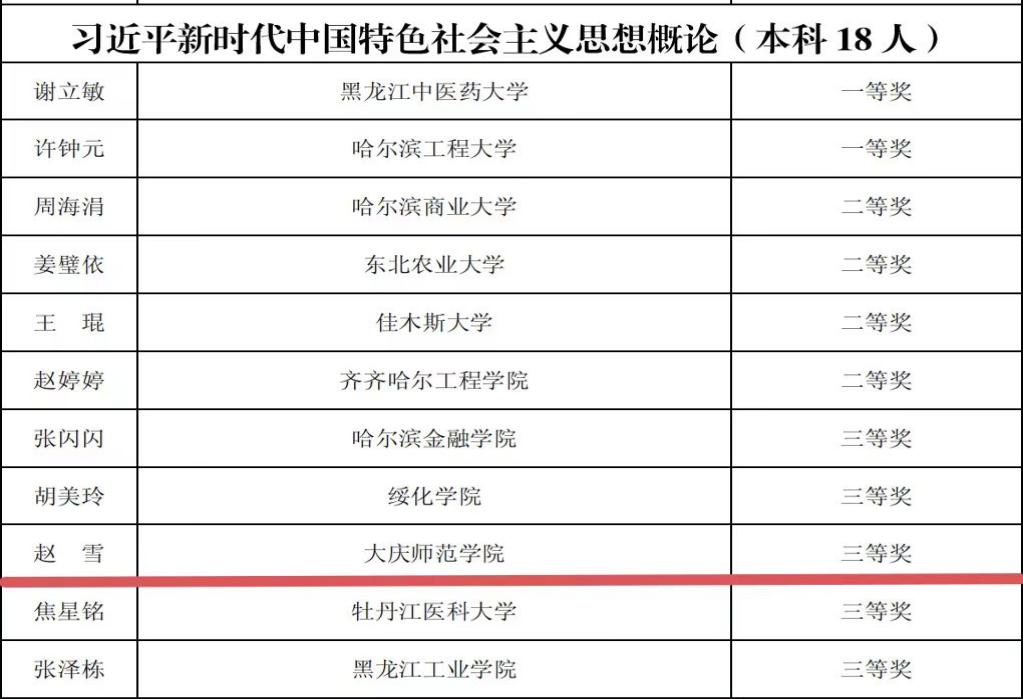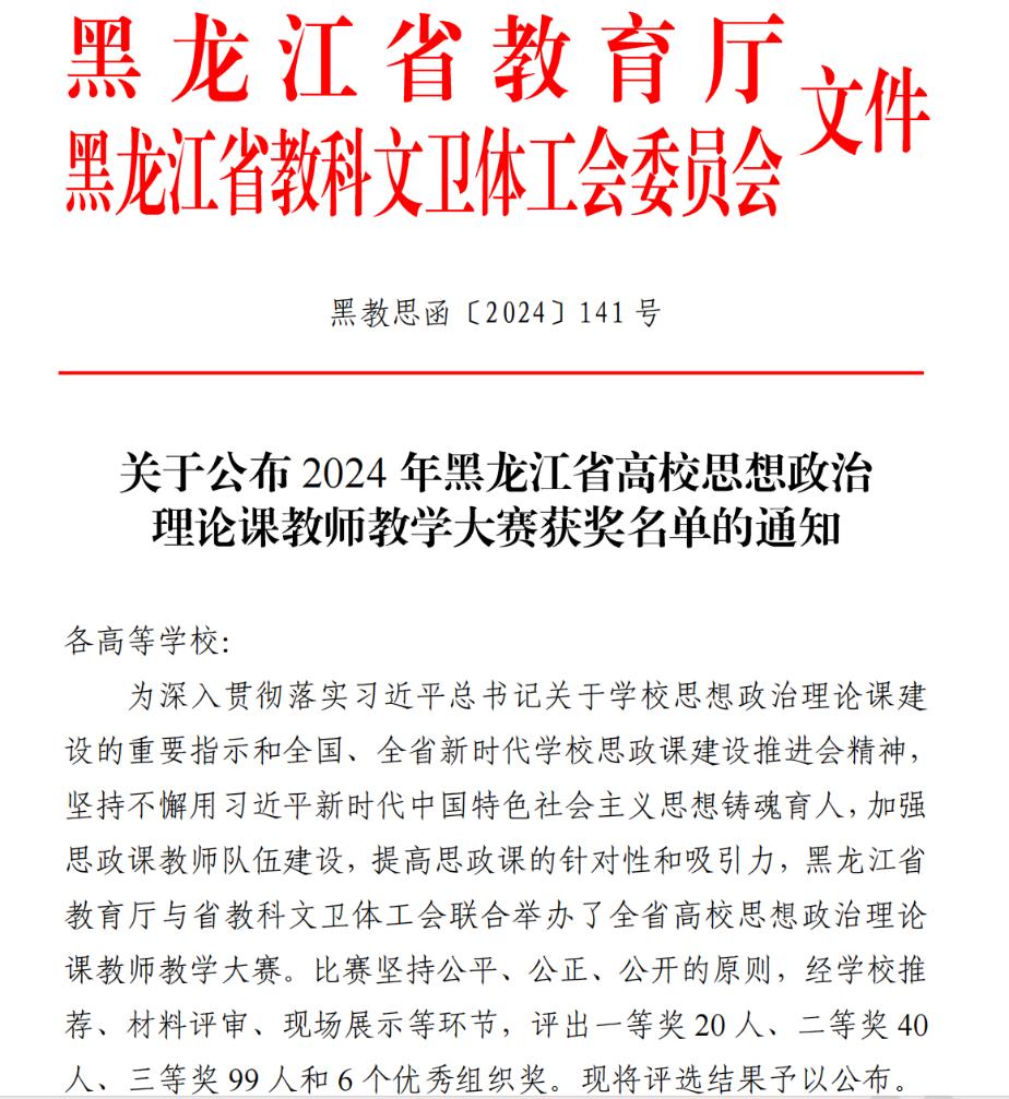 日前,黑龙江省教育厅与黑龙江省教科文卫体工会委员会发布了《关于公布2024年黑龙江省高校思想政治理论课教师教学大赛获奖名单的通知》,我校思政课教师李玉娣荣获二等奖,赵雪、李丹玮、张博荣获三等奖,获奖数量实现新突破,创历史最好成绩。