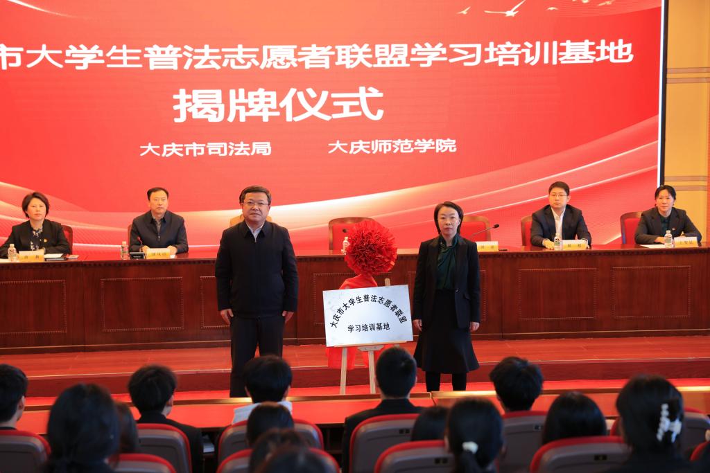 姜世兴、刘迪共同为大庆市大学生普法志愿者联盟学习培训基地揭牌。