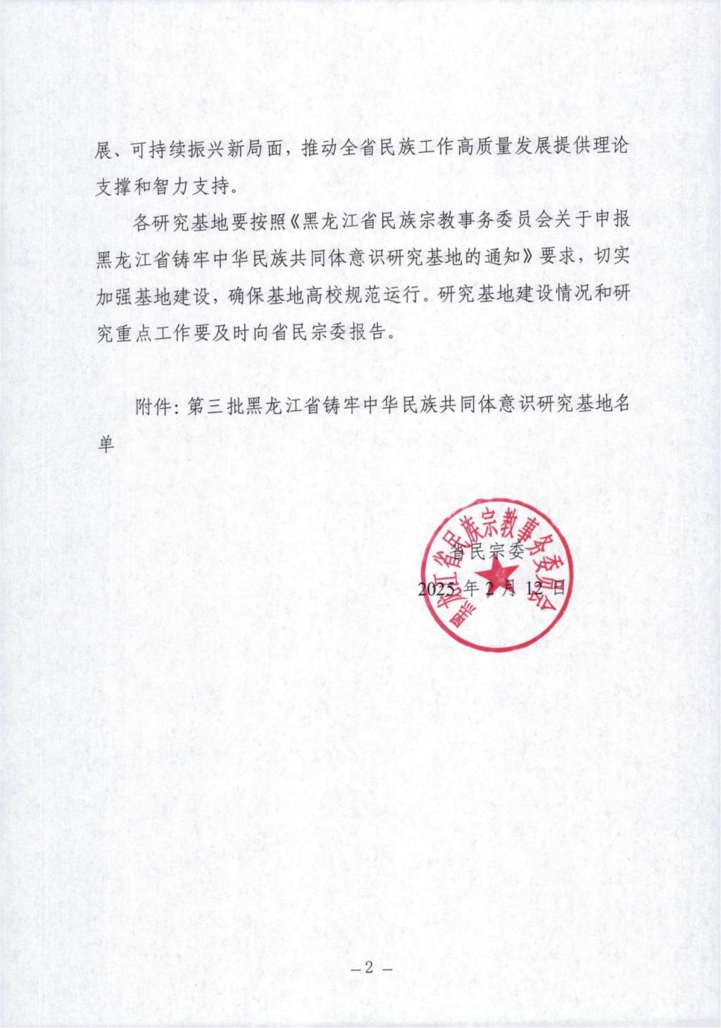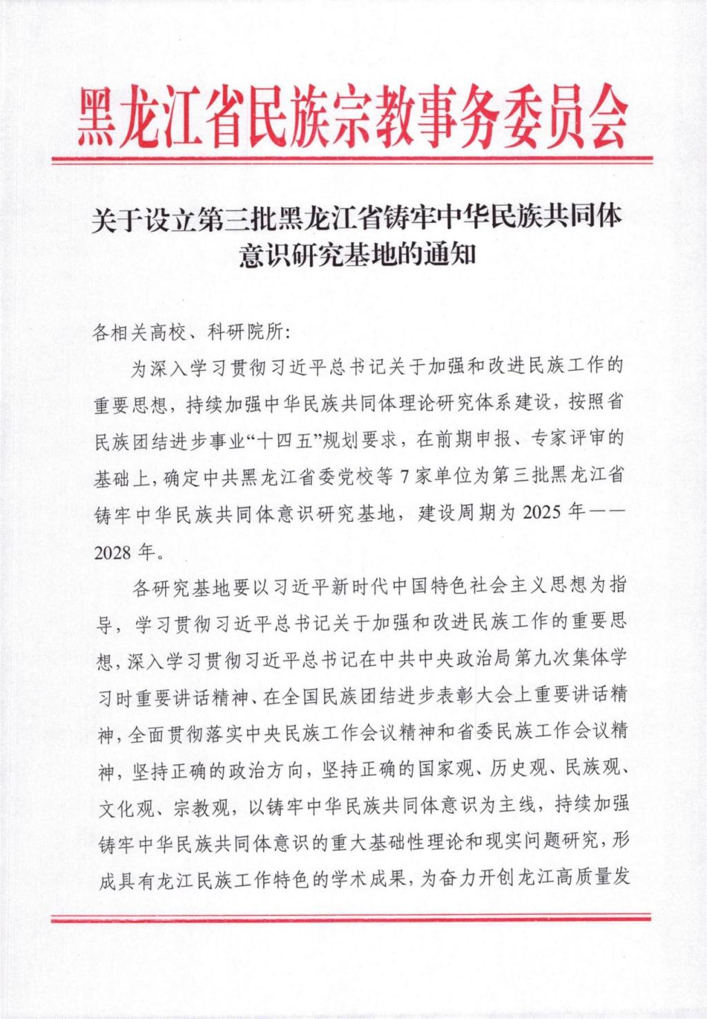 近日,黑龙江省民族宗教事务委员会印发《关于设立第三批黑龙江省铸牢中华民族共同体意识研究基地的通知》,确定中文字幕日韩精品有码视频-久久免费区一区二区三波多野-中文字幕人妻A片免费看-精品视频一区二区在线看-好男人在线社区WWW等7家单位为第三批黑龙江省铸牢中华民族共同体意识研究基地。这是我校在省级科研基地建设上取得的又一项重要成果。