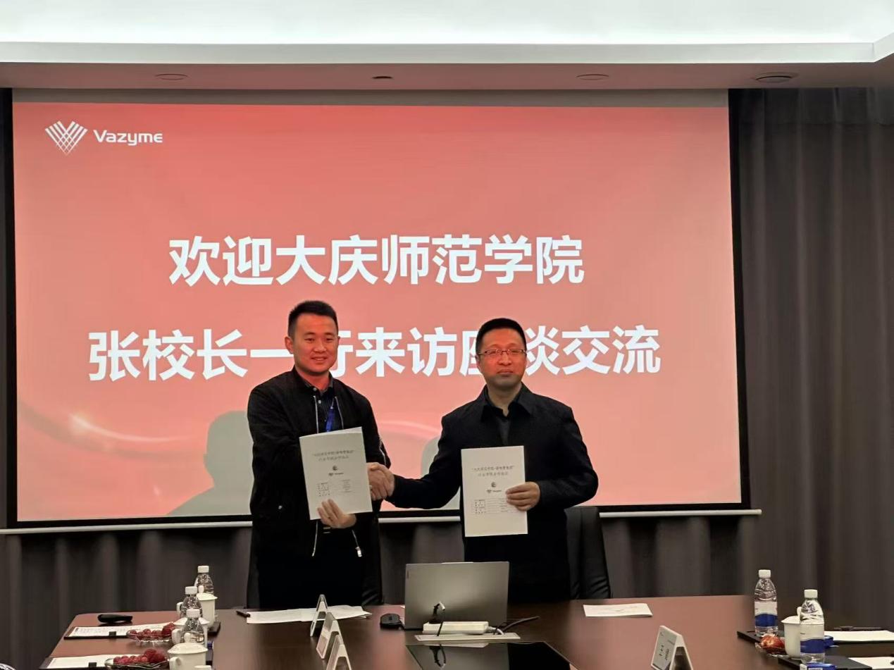 在诺唯赞生物科技股份有限公司,张平一行在人事总监张国洋的陪同下,参观了企业的生产基地和研发大楼,签订了校企合作协议和校企订单班协议,在诺唯赞订单班人才培养、课程建设、实验室建设、学生就业、产业学院建设等方面达成广泛共识,并与学校毕业生亲切交流。
