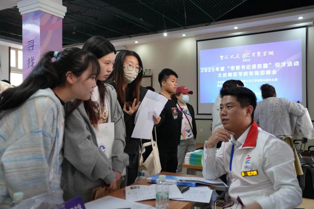 招聘会首先播放了市委书记寄语、大庆市城市宣传片和《新时代大庆人才振兴20条》宣介片,对现场毕业生发出留庆发展邀请。各设岗县区围绕人才政策、人才发展环境、职业发展规划等进行现场宣讲,我校毕业生代表分享了自己在庆工作的经历,为学弟学妹们求职就业提供建议。