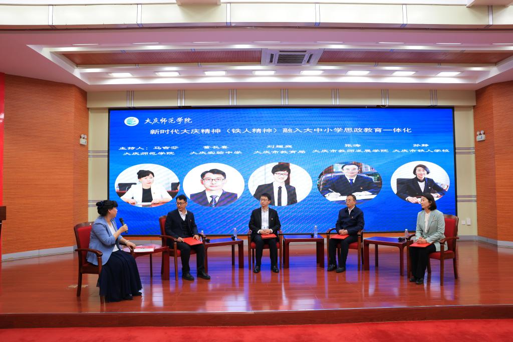 圆桌论坛环节,大庆实验中学副校长董长喜、大庆市教育局德育科科长刘耀庭、大庆市教师发展学院副院长张涛、大庆市铁人学校校长孙静,以及我校马克思主义学院院长马吉芬,围绕大庆精神(铁人精神)融入思政教育的特色实践、现存挑战与突破路径,从基础教育一线经验、教研指导策略、行政统筹规划及高校理论创新等维度,共商新时代思政教育一体化建设的创新发展之道。实验中学依托“1256”大思政育人体系,以主题式、体验式、贯通式三大路径深化实践;铁人学校创新“铁人+”理念,构建“井式”模式与“三位一体”协同机制;大庆市教师发展学院通过“六个引领”策略驱动精神融入思政课堂;大庆市教育局将精神教育纳入国民教育体系,形成“六个一百”成果,为新时代思政教育高质量发展提供系统性、创新性解决方案。