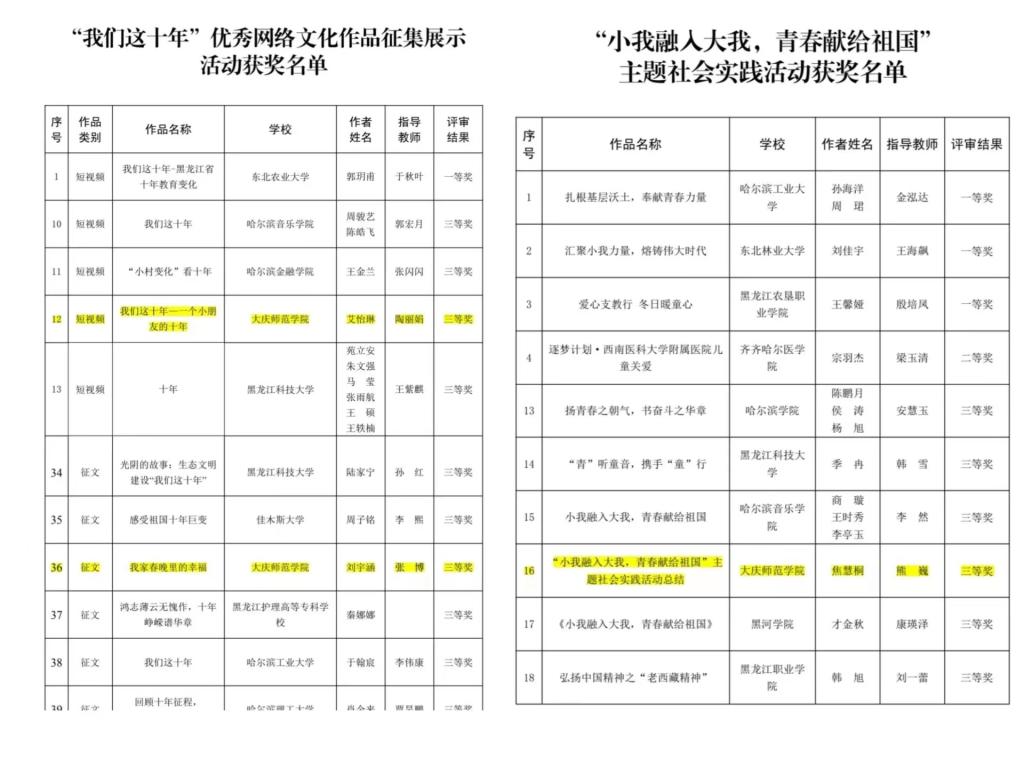 此次主题展示活动由省委教育工委组织开展,经高校初评、推荐,省委教育工委组织专家评审,共评选出一等奖19项、二等奖38项、三等奖68项。其中,我校外国语学院陶丽娟老师指导艾怡琳同学的短视频作品《我们这十年——一个小朋友的十年》和马克思主义学院张博老师指导刘宇涵同学的征文作品《我家春晚里的幸福》在“我们这十年”优秀网络文化作品征集展示活动中荣获三等奖;教师教育学院熊巍老师指导焦慧桐同学的作品《“小我融入大我,青春献给祖国”主题社会实践活动总结》在主题社会实践活动中荣获三等奖;马克思主义学院张文彬老师指导刘晓宇、江思媛、纪滋满同学的作品《与时代同行和人民同向——践行“以人民为中心”的根本立场》在“我心目中的思政课”优秀教学资源征集展示活动中荣获三等奖;马克思主义学院张博老师指导李成龙同学的作品《在新征程中践行二十大精神》在“新征程·青年讲”党的二十大精神主题宣讲活动中荣获三等奖。
