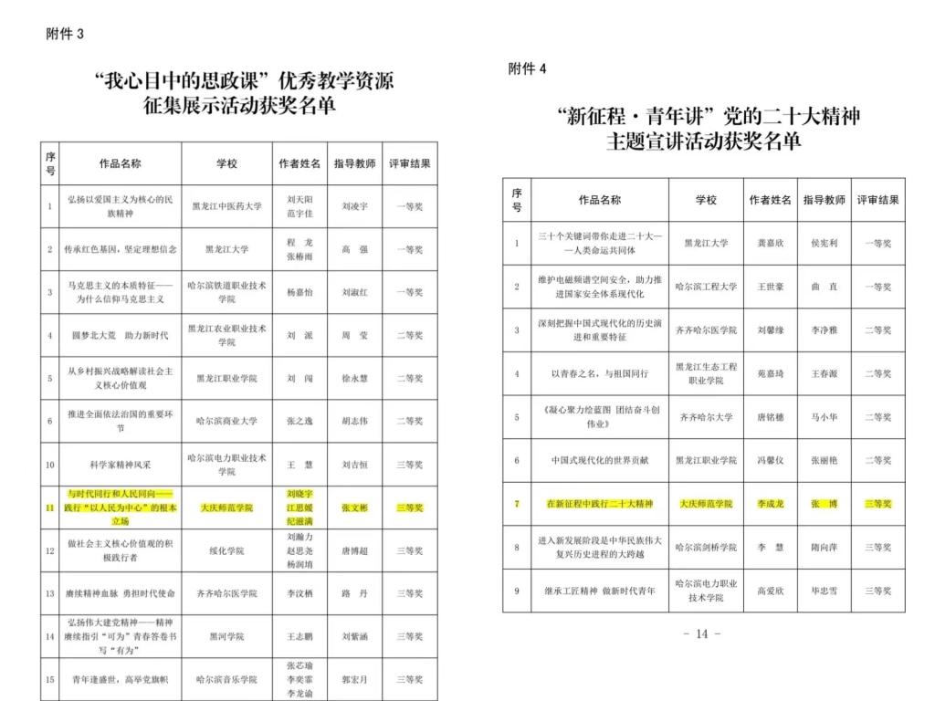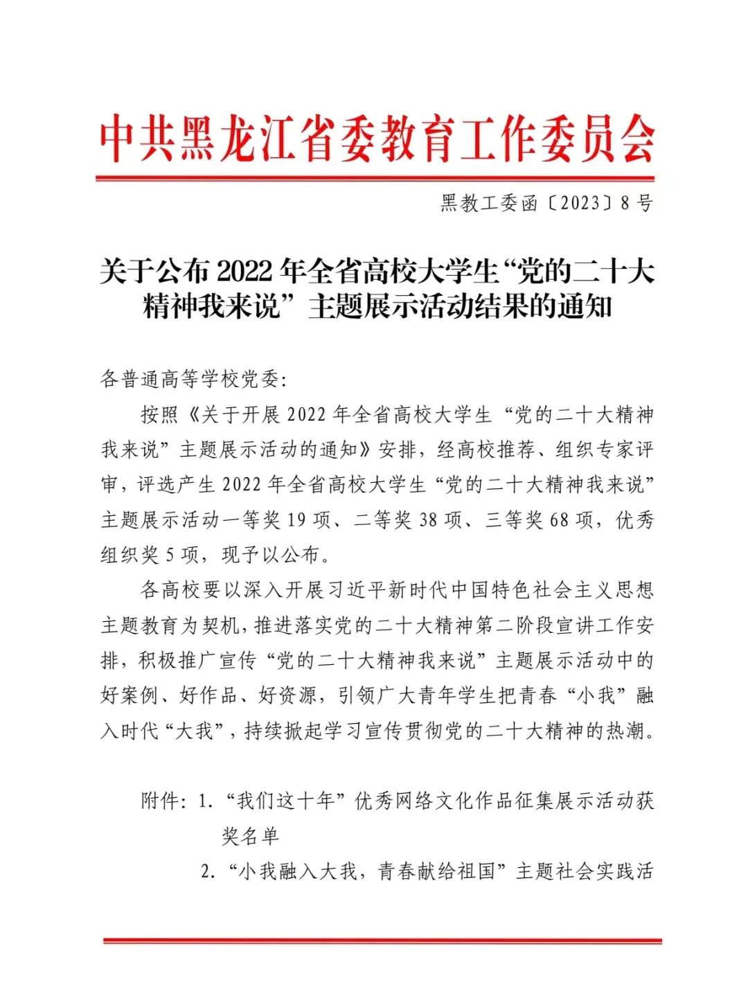 近日,黑龙江省委教育工委公布了2022年全省高校大学生“党的二十大精神我来说”主题展示活动获奖名单,我校报送的参赛作品在众多作品中脱颖而出,荣获三等奖5项。