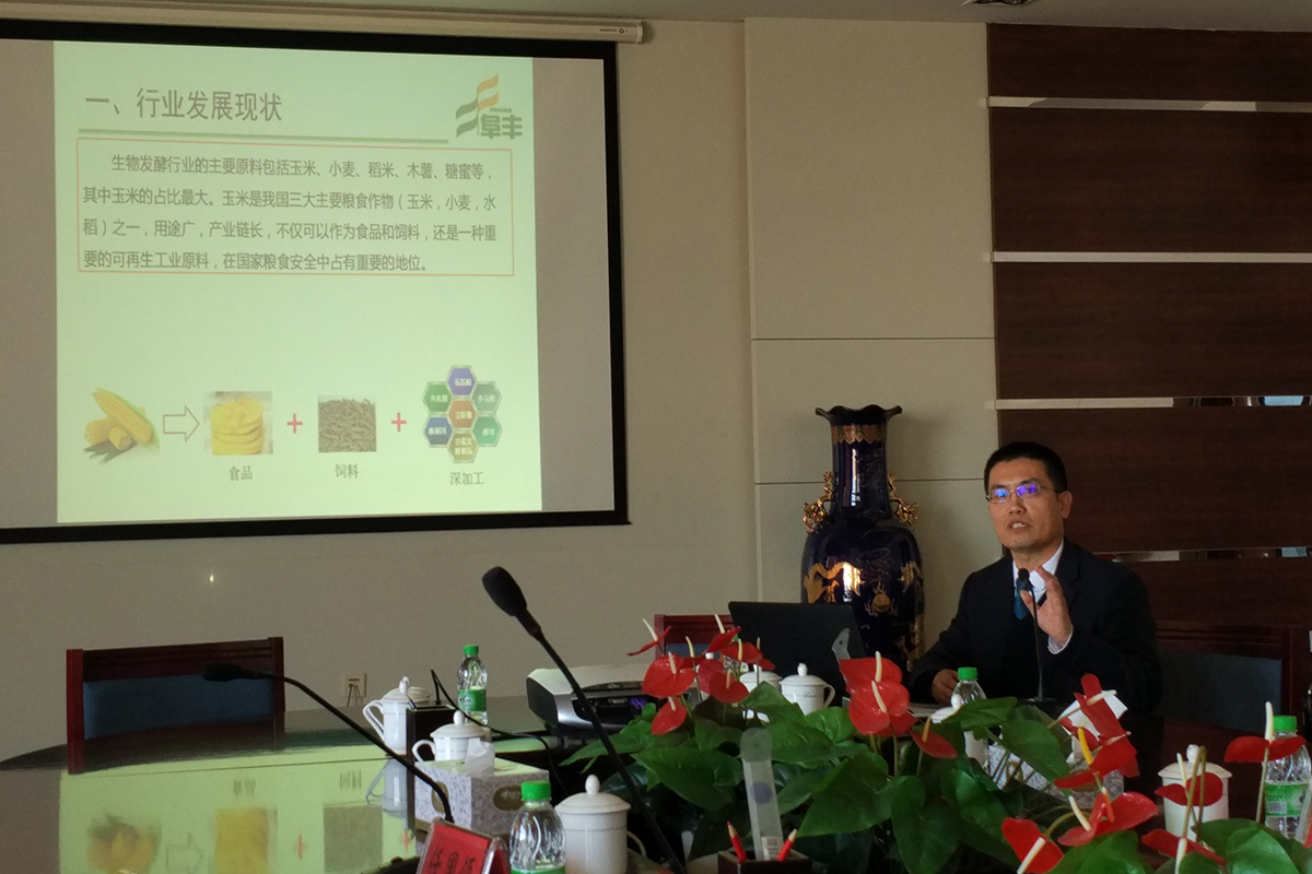 证书颁发仪式结束后,赵兰坤总经理为学院领导、师生代表作了题为“生物发酵(氨基酸)行业发展现状探讨及东北阜丰公司生产研发现状介绍”的报告,赵兰坤总经理从行业发展现状、阜丰集团发展情况、东北公司发展情况、谷物深加工、产学研结合情况、企业环保、集团未来规划等六个方面作了一个内容十分丰富的报告。