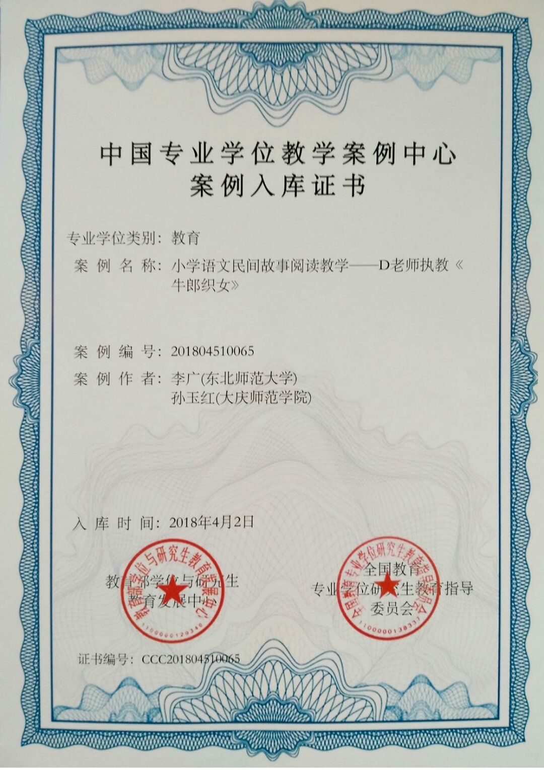 由文学院孙玉红老师参与开发的教育案例“《小学语文民间故事阅读教学——D老师执教《牛郎织女》”成功入选中国专业学位教学案例中心案例库,实现我校入选中国专业学位教学案例中心库案例的零突破。