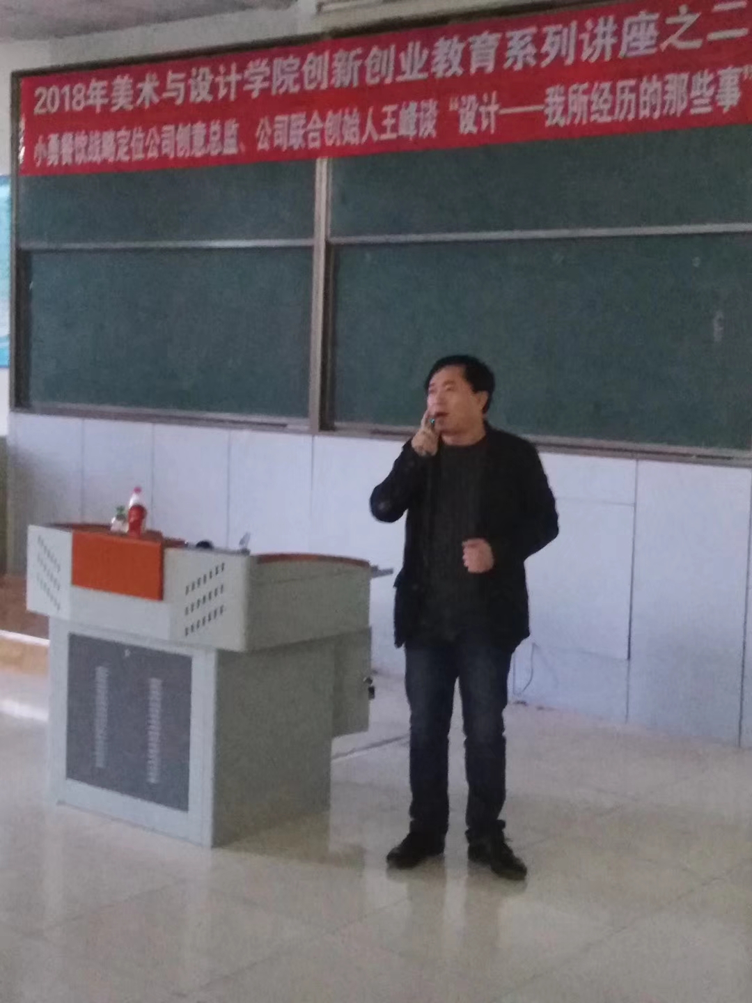 王峰先生现为小勇餐饮战略定位公司创意总监,公司联合创始人,设计从业近22年。2013年以来,在全国成功实施餐饮定位设计案例700余项,餐饮设计作品多次获中国CIDA商业空间设计大奖。讲座中,王峰先生以丰富的设计实战经验,从他的学习、成长经历以及主持实施的设计案例等多个层面进行了讲解和分析。尤其是以多项成功的设计案例,从艺术设计、艺术创意、设计与商业结合以及环境设计与视觉传达设计的巧妙融合等方面进行了深入的剖析,并通过企业和个人成功创业案例启发学生,对学生设计观念的更新、设计理念的拓展和创业精神的培养具有积极的促进作用。