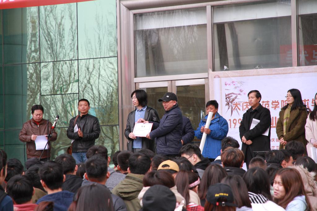 开幕式上,大庆市美术家协会副主席、中国画艺委会主任董新杰教授和大庆市美术家协会名誉主席耿起锋教授先后发表讲话,对边永会的艺术创作给予充分肯定,对作品所呈现出的艺术特色给予较高评价,并鼓励他多创作出更多精品。为了感谢母校的培养,边永会老师将精心创作的《清荷图》捐赠给母校;鉴于边永会老师多年来取得优秀的艺术业绩,美术与设计学院聘请边永会老师为兼职教授,美术与设计学院院长孙大力教授为边永会老师颁发了特聘证书。