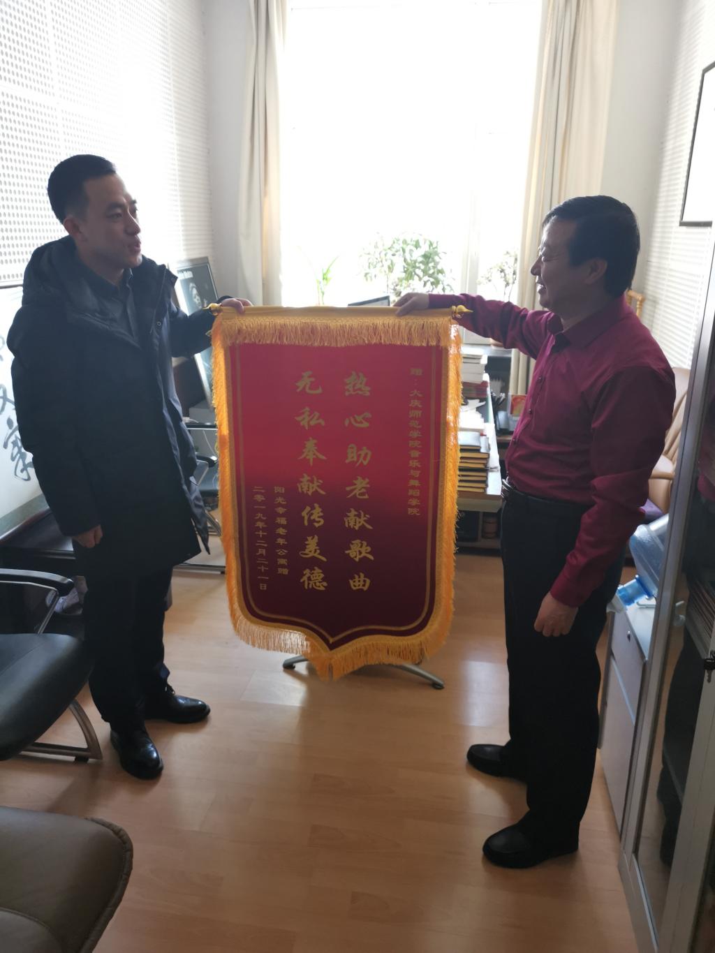 23日上午,为了表达感谢之情,阳光幸福敬老院的老板和院长代表老人们来到学院,把精心制作的“热心助老献歌曲,无私奉献传美德”锦旗敬献给学院,感谢学生们给敬老院的老人们带来这么多美好的回忆,老人们都特别喜欢孩子们的演出,期待他们的再次到来。(撰稿:沈天磊 审核:孙洪波)