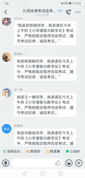其次,做好线上考试考务准备工作。线上考试无法实现类似于线下考试的学生身份核对,我们尝试使用钉钉视频会议,通过视频图像核对学生身份。提前对学生进行诚信考试教育,考前线上完成诚信考试承诺。学院和任课教师一起思考考试监考事宜,采取钉钉视频会议全程监控和学习通考试监考双运行的方式,确保考试在公平环境下运行。对于线上考试进行充分估计。若是网络不给力、考试课程平台出现极端不稳定情况,设计了预案,确保考试顺利进行。