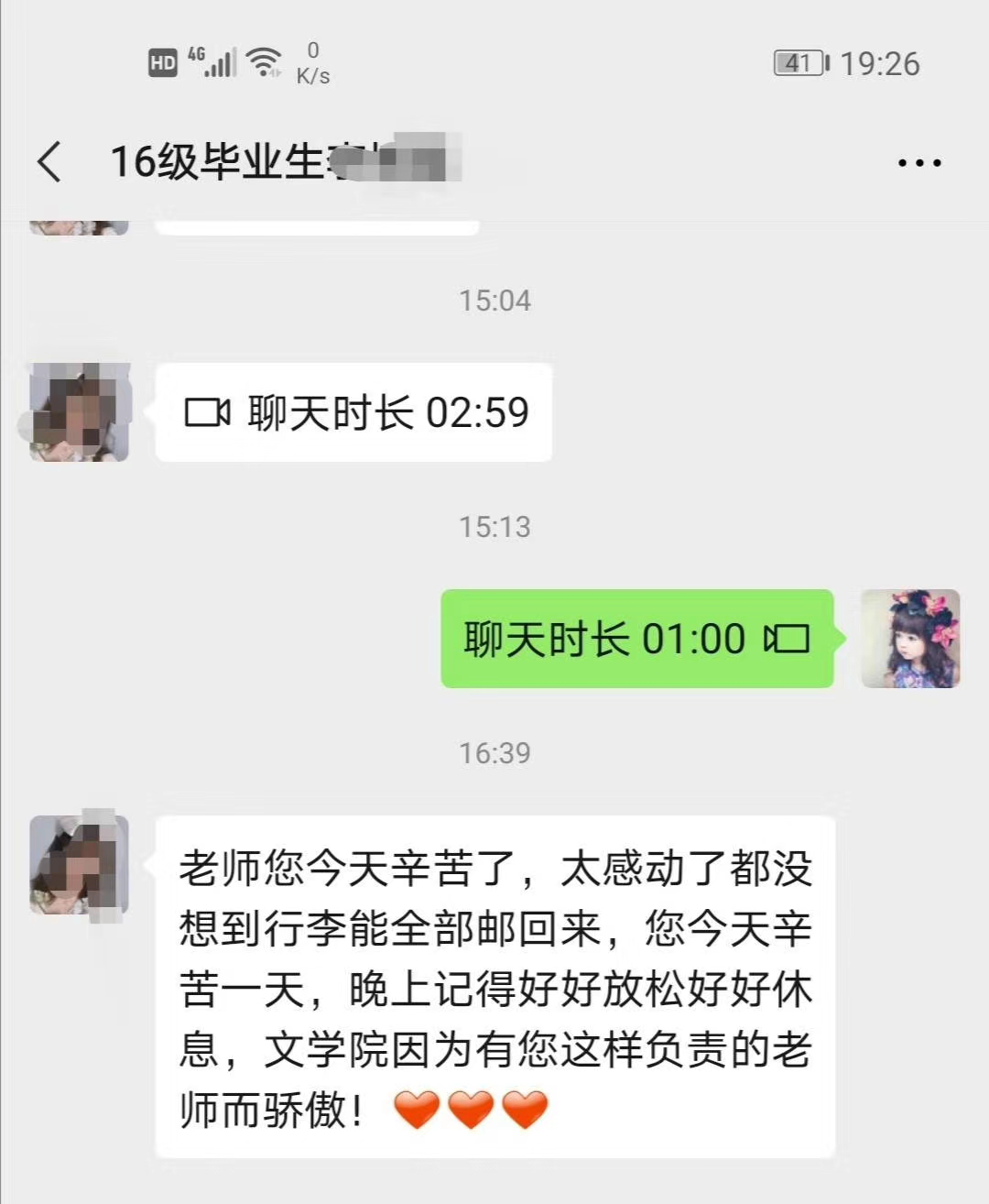 “老师,您辛苦了”“老师,我的柜子太乱了,不好意思让您受累了”“感谢各位老师,大庆的天气雨过天晴,学生们的心也随着一份份行李得成功打包变得快意轻松。隔离病毒但不隔离爱,疫情总有过去时,我们期盼着,以初入社会成功的模样重返校园,再把这次匆匆的别离好好闻燃”,这几天文学院的老师们收到最多的就是来自毕业生的感谢。此时的大学里本应该交织着淡淡的离愁别绪和青春将要放飞的喜悦,受疫情影响,毕业生的心里有着各种各样的遗憾,无法与相伴四年的教学楼告别、无法返校参加毕业典礼与亲切的师长合影...