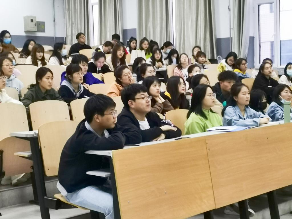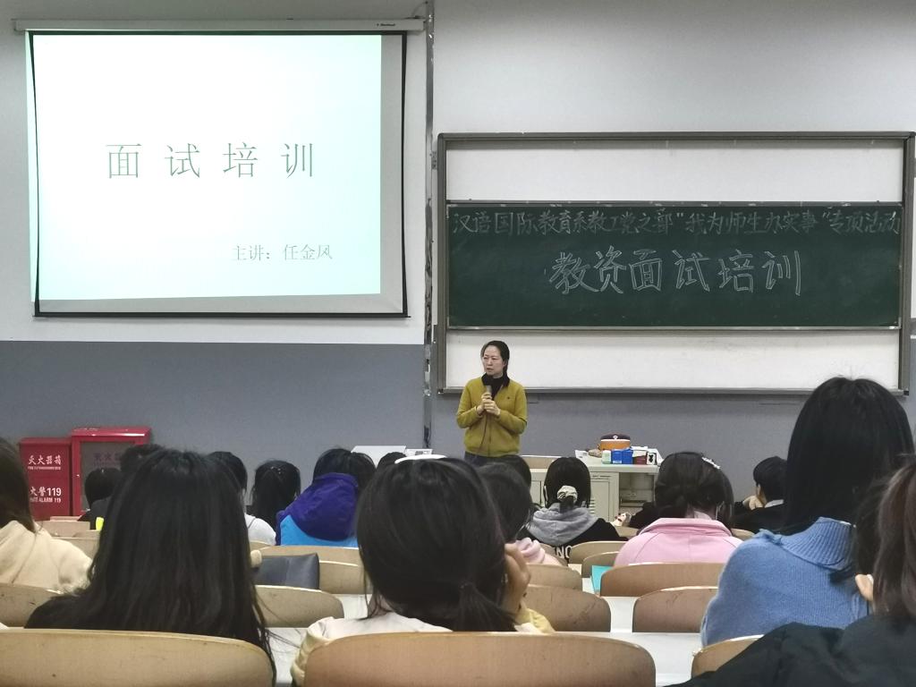 伴随着国家对师范专业建设的关注和投入,家长和学生对师范类就业前景非常看好,许多在校大学生报名教师资格证考试。如何高效准备教师资格面试?教师资格面试环节有哪些重要环节?该如何准备试讲等问题成为许多学生关注的热点问题,尤其是4月初教师资格笔试成绩公布后,文学院近40余名学生将要参加面试,迫切希望获得专业性指导。汉语国际教育系教工党支部了解到这一信息,主动向学院请缨。 4月19日晚,汉语国际教育系教工党支部书记任金凤副教授,在文学院阶梯教室为参加面试的同学开展专业培训。任金凤老师从面试流程和面试内容两个部分讲述并分析了教师资格面试的标准,从九个面试技巧指出了如何能顺利通过面试,从四个结构化试题类型中总结了答题的内容。以知识、能力、态度三个新课标理念及权威性、基础性、前瞻性这三个面试特点,向同学们解读面试的目标。在面试流程方面,她具体说明了由抽题、备课到试讲的流程,并结合同学模拟上课的表现,指出存在的问题,提出整改的建议。她说:“上课不是一个人在自言自语,也不是一个人自导自演了一场戏,课应该是要讲给学生听的而不是讲给评委听的。”针对面试的内容,任老师推荐了小学课本目录以及初高中统编版语文课本目录,方便了学生下一步试讲备课。同时她也强调,面试时务必注重仪态仪容,适当加上身体动作,为人师表,要端正,要沉稳,最重要的是面带笑容。现场的同学聆听记录了面试的相关注意点,也向任金凤老师提出自己的疑惑,老师进行了耐心解答。