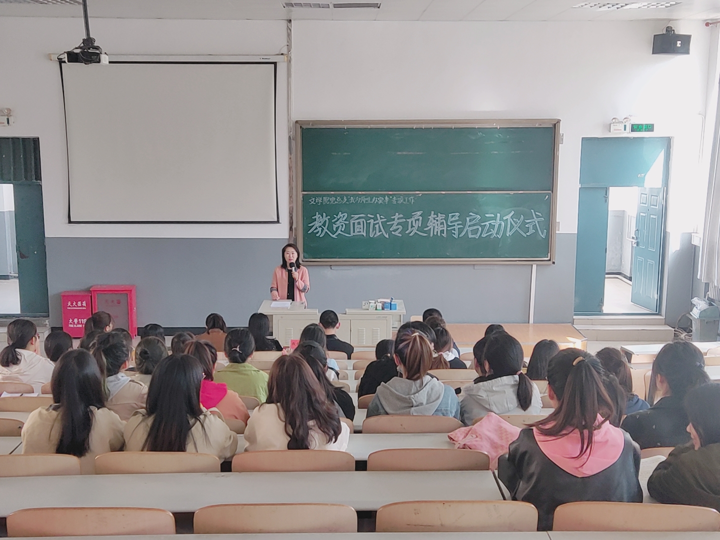 4月25日下午,文学院在阶梯教室举行了“教资面试专项辅导”启动仪式,文学院党总支书记、院长赵丽教授,参与辅导工作的党员教师代表和学生参加了启动仪式。