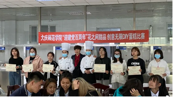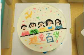 2021年4月28日下午14点,由美术与设计学院主办的“迎建党一百周年”花食间甜品创意无限DIY蛋糕比赛正式开始,全校13个学院参与此次大赛,并通过抖音平台直播大赛现场。本次大赛参赛队伍由各学院选派的一支3名学生组成的团队组成。通过比赛,大赛共评选出一等奖1组,二等奖2组,三等奖3组,特别创意奖1组。