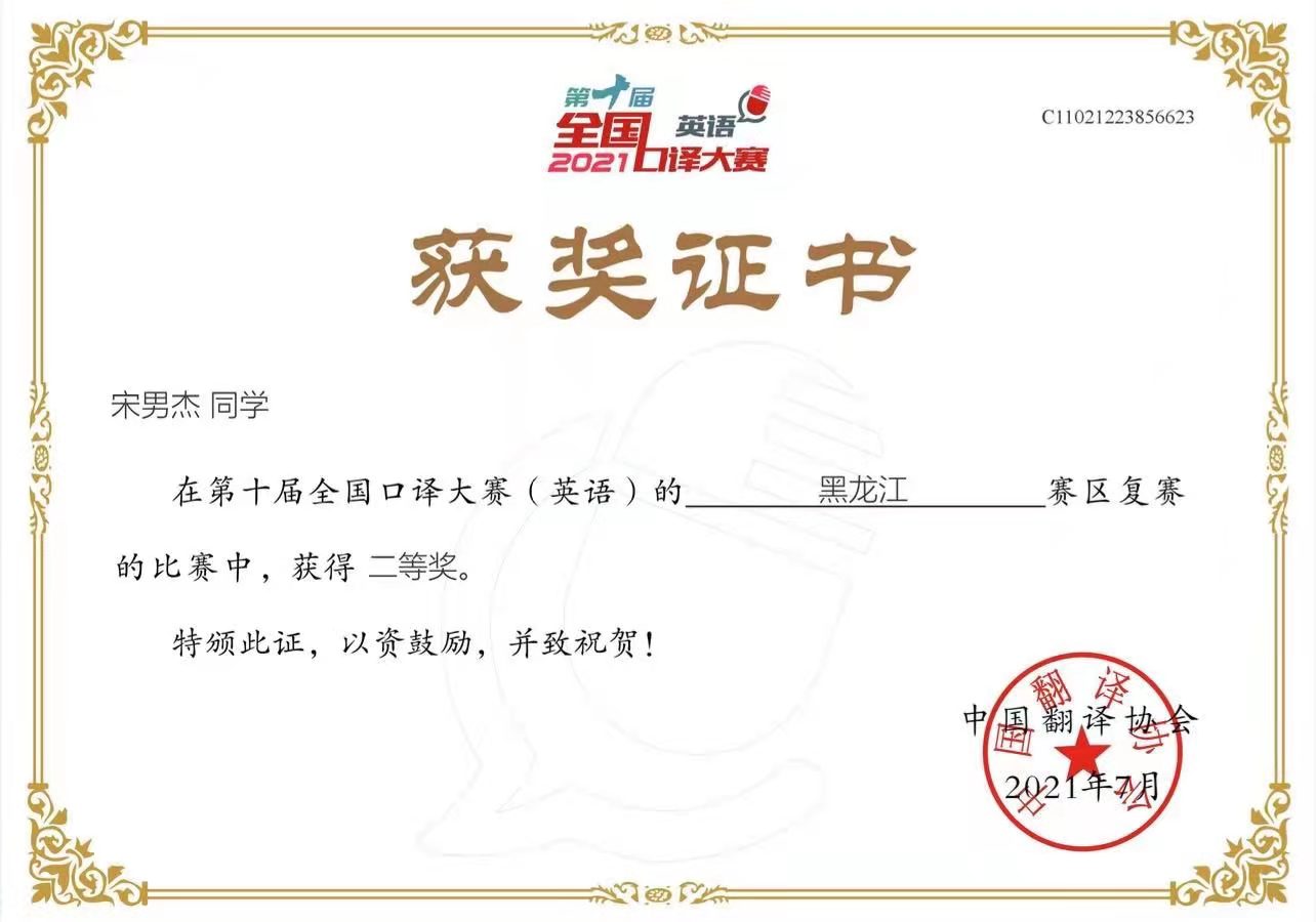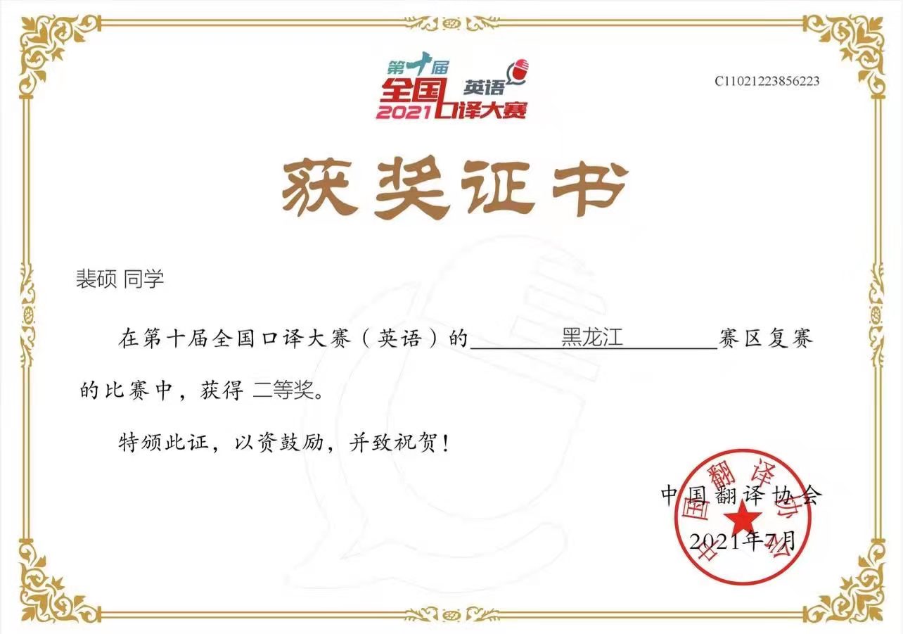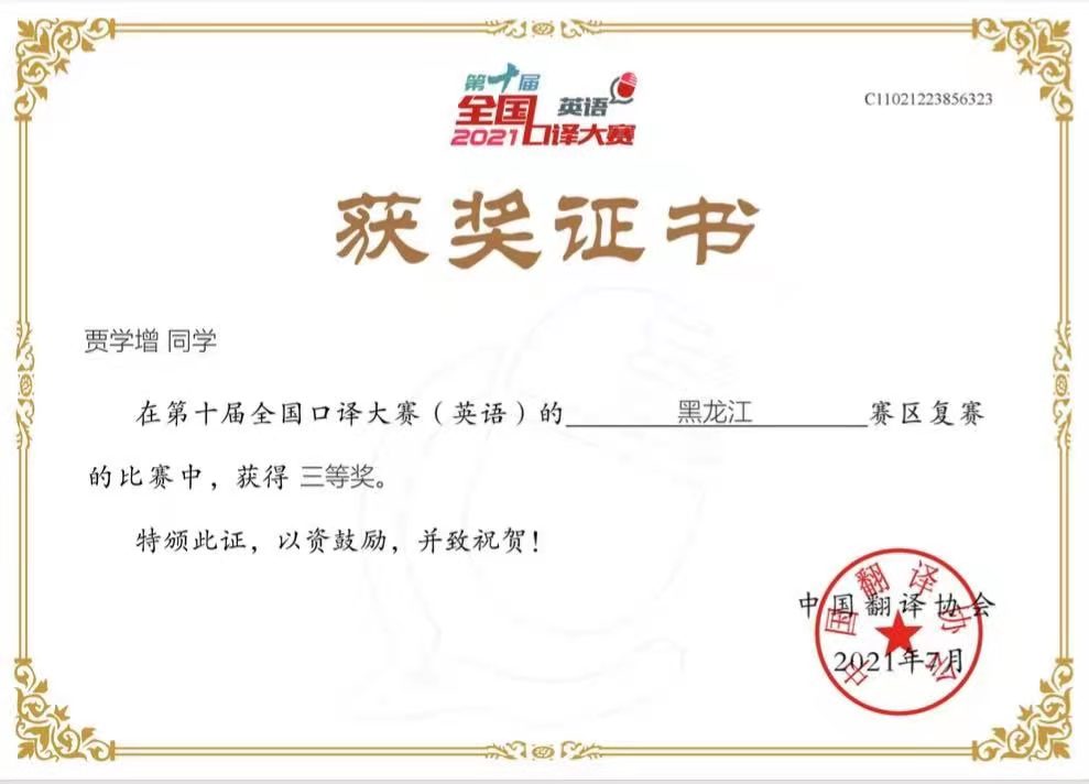 翻译系指导教师李嬿带领大三优秀选手裴硕、宋男杰、贾学增参赛,翻译系指导教师张小川带领大四优秀选手张胜琼参赛,与来自黑龙江省39所高校的98名选手同台竞技。经过激烈角逐,裴硕和宋男杰同学荣获黑龙江赛区二等奖,贾学增和张胜琼同学荣获黑龙江赛区三等奖的优异成绩。
