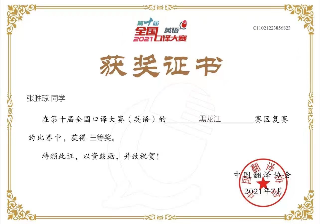 2021年6月30日,第十届全国口译大赛黑龙江省复赛成功举办,外国语学院派出4名选手参赛。来自翻译系的3名选手和来自商务英语系的1名选手经过激烈拼杀,取得突破性成绩并全部晋级,即将参加全国交替传译半决赛,代表黑龙江省同来自北方大赛区的北京、天津、河北、辽宁、吉林等省市的选手竞技,这是我校参加该赛事以来取得奖项人数最多、成绩最好的一次。