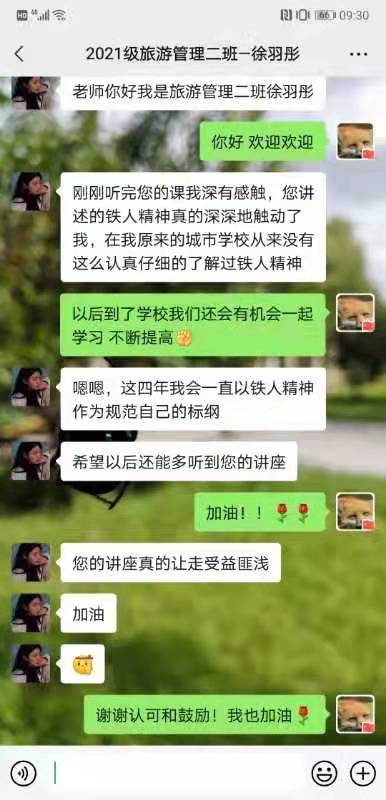 经济管理学院旅游管理二班徐羽彤同学说:“陈老师,刚刚听完您的课,我深有感触,您讲述的铁人精神深深地触动了我,在我原来的城市学校从来没有这么认真仔细的了解过铁人精神,这四年我会一直以铁人精神作为规范自己的标准”。