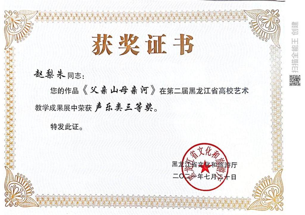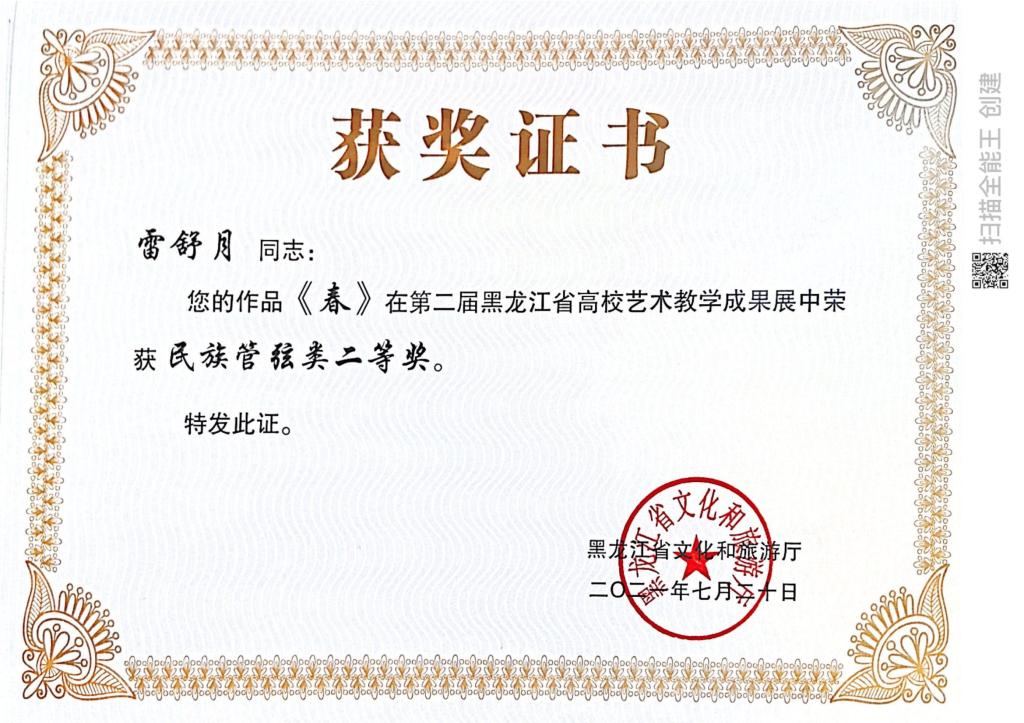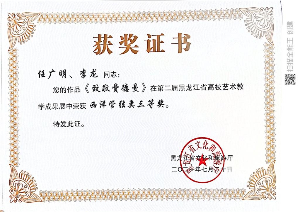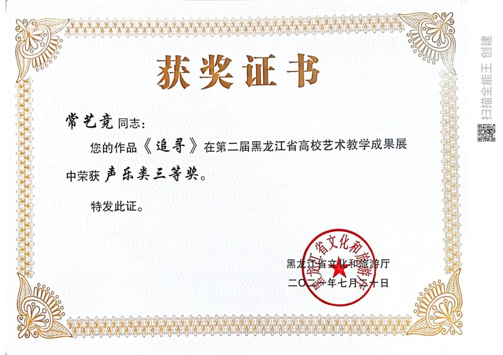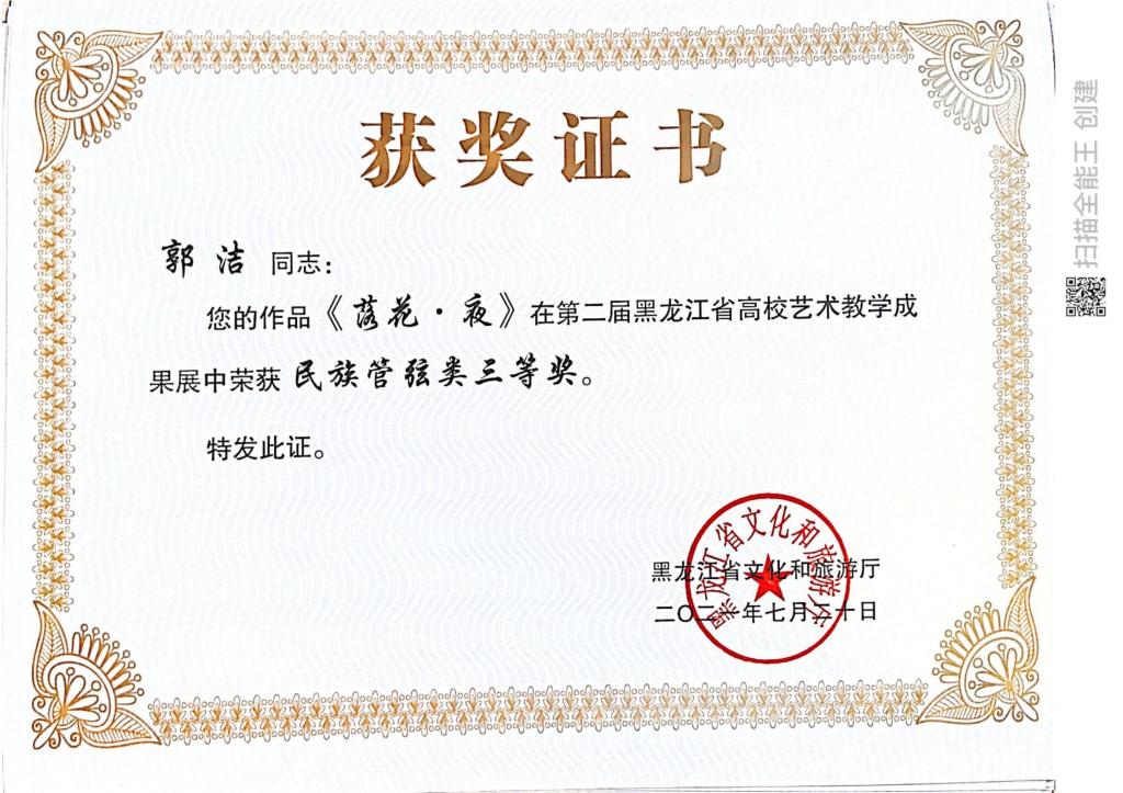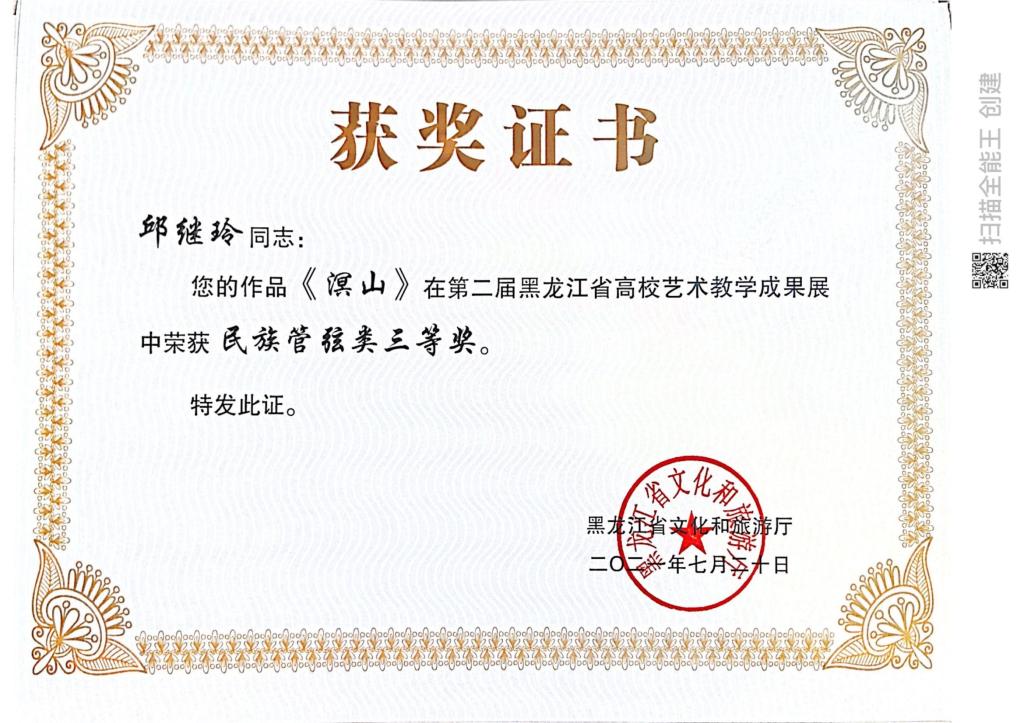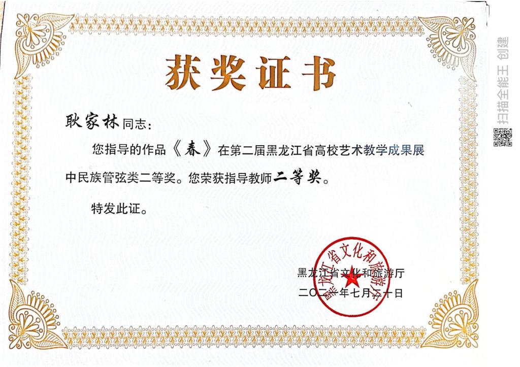 近日,由黑龙江省文化和旅游厅主办的“黑龙江省第二届全省高校艺术教学成果展示”评选结果揭晓。我院在教学成果展示活动中获奖16项,其中教师组获得一等奖1项、二等奖3项、三等奖1项,学生组获得一等奖1项,二等奖4项,三等奖6项。