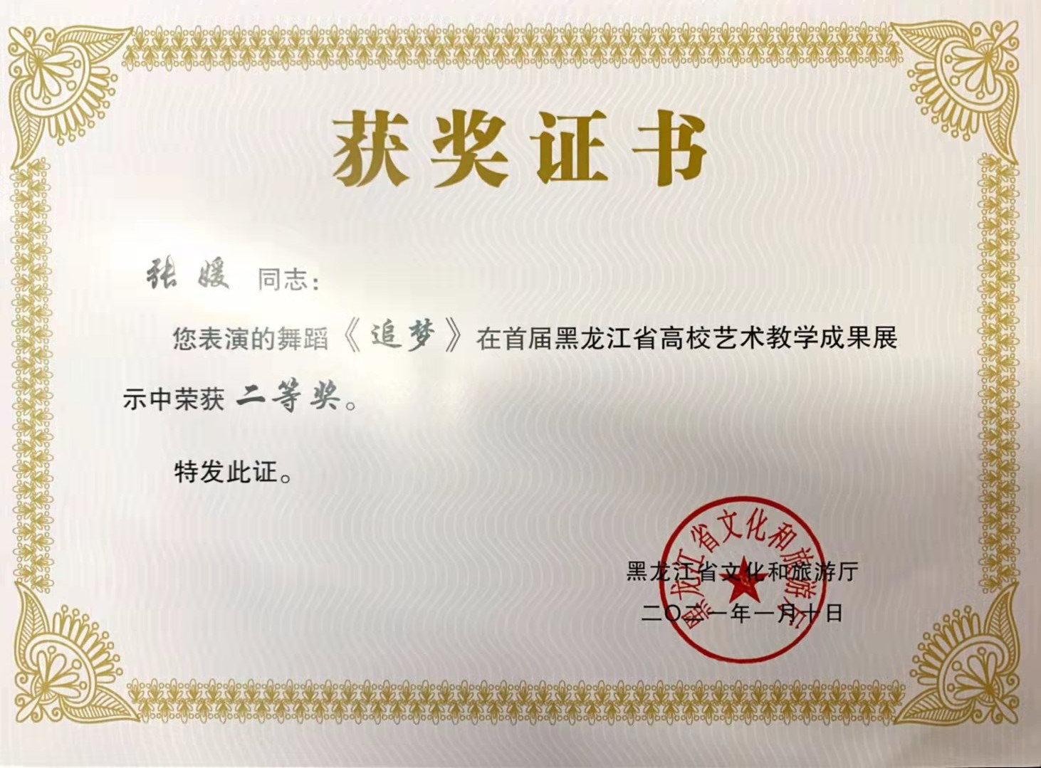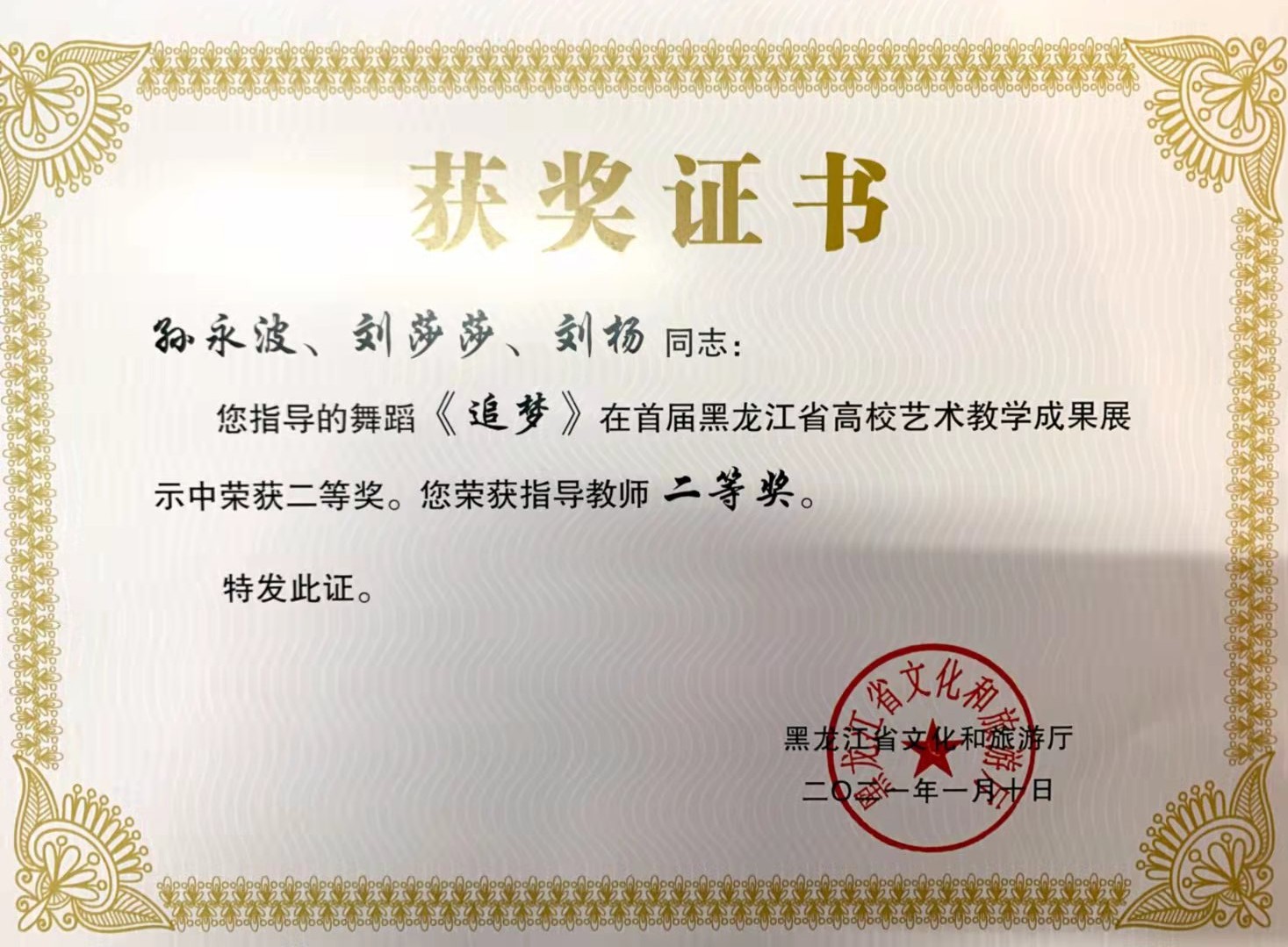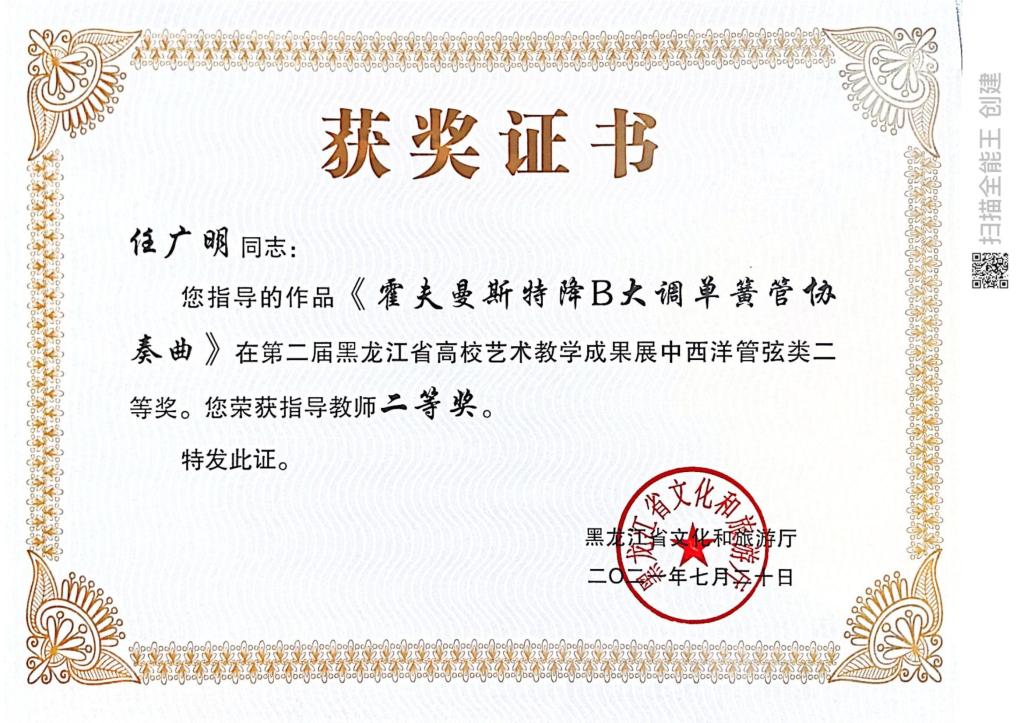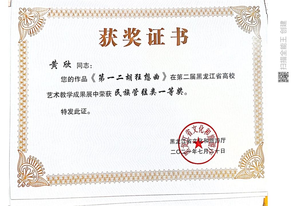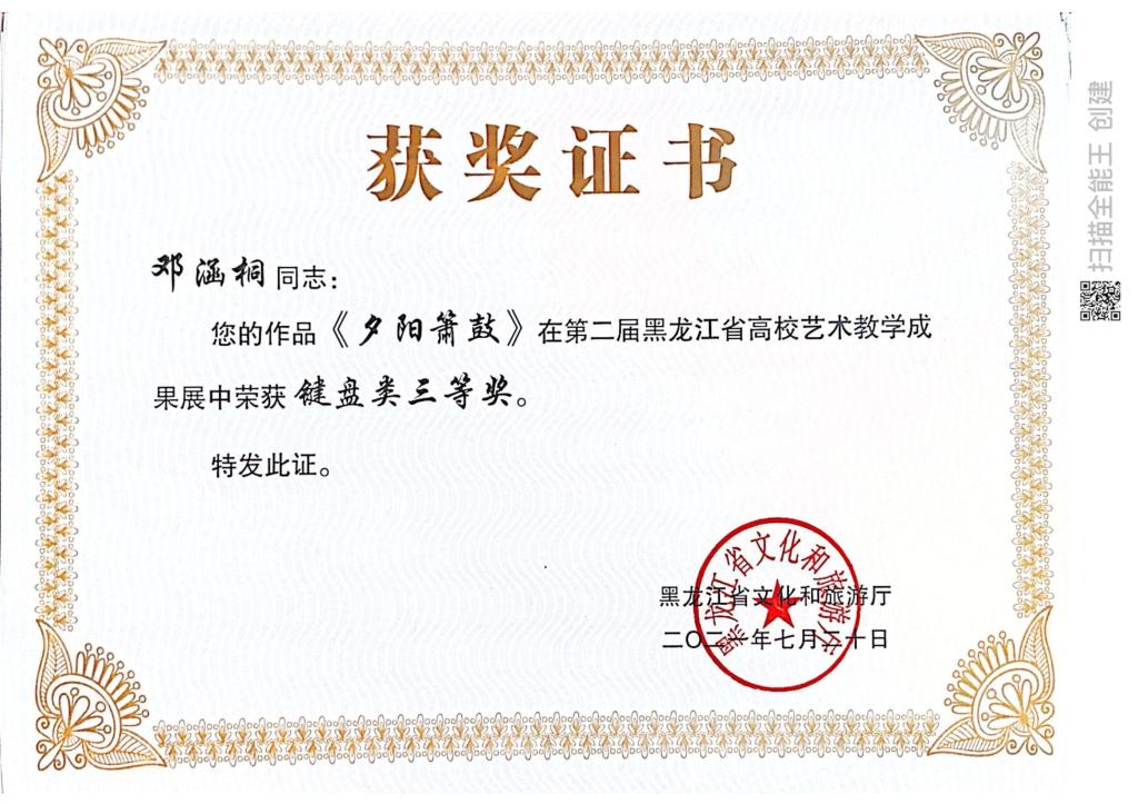 近日,由黑龙江省文化和旅游厅主办的“黑龙江省第二届全省高校艺术教学成果展示”评选结果揭晓。我院在教学成果展示活动中获奖16项,其中教师组获得一等奖1项、二等奖3项、三等奖1项,学生组获得一等奖1项,二等奖4项,三等奖6项。