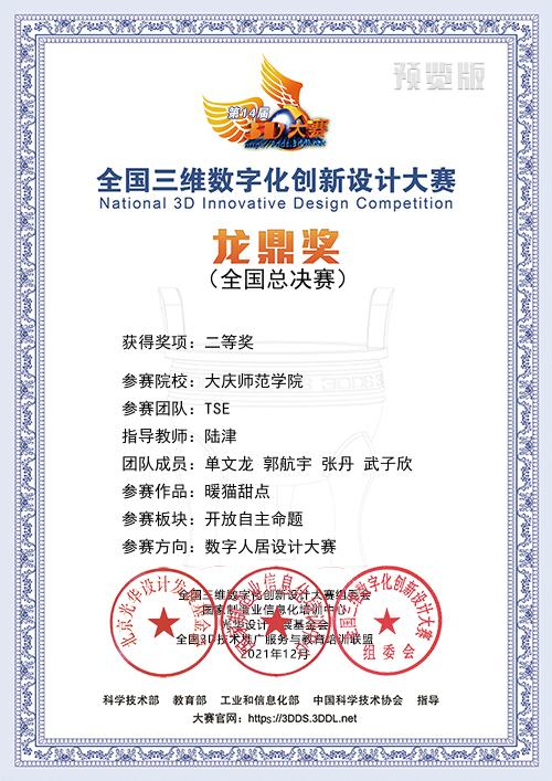 美术与设计学院高度重视这一赛事,在校内选拔赛环节参与学生近百人,共收到近30套作品,经严格筛选、评审最终向省赛区推送10套作品。12月4日至5日,陆津老师指导的学生单文龙(作品《暖猫甜点》)、霍胜男老师指导的学生郭晓泳(作品《杯酒》)代表黑龙江赛区参加了全国3D大赛年度总决赛(数字人居设计赛项),最终获得全国二等奖一项、三等奖一项,为学校赢得了荣誉。(撰稿:陆津 审核:孙大力 编辑:姜丰翼 )