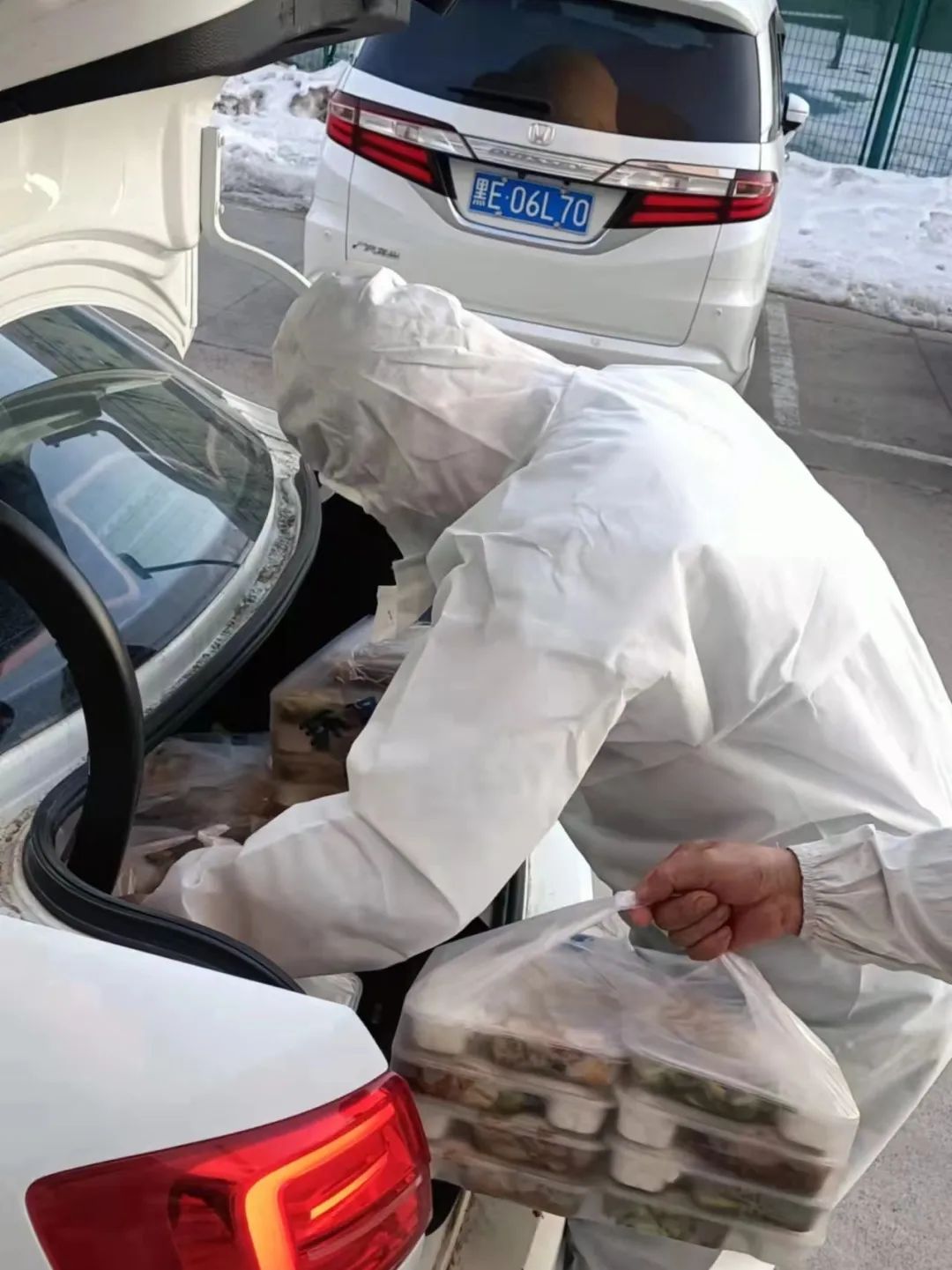 学生二餐厅餐饮公司除了配送校内隔离学生盒饭,还承担了艰巨的校外隔离学生送餐工作。为安全、有效完成学校的工作安排,学生二餐厅店长主动申请成为一名送餐志愿者,做好个人防护,驾驶自家车辆,每日三餐前往校外四个隔离点运送盒饭,每日运送盒饭1600余份。