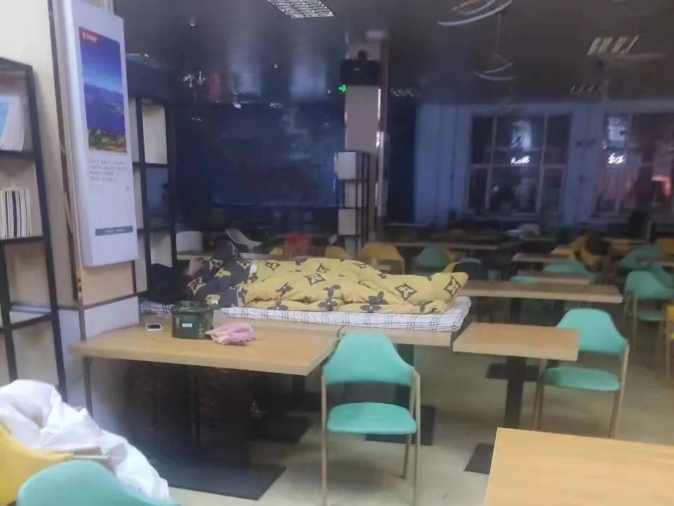 滞留在校的食堂、超市等工作人员,他们每天工作、吃、住均在食堂,为保障在校学生和教职工集中供餐,每天工作时间达14小时以上,有的甚至每天仅休息3个小时。由于事发突然,食堂里缺少床和行李,大多数员工们睡在洗碗间的货架上,睡在拼起来的桌子上,有的更是直接在冰凉的地板上打地铺……