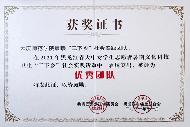 近日,共青团黑龙江省委员会、黑龙江省学生联合会共同发布了2021年黑龙江省大中专学生志愿者暑期文化科技卫生“三下乡”社会实践活动评选结果,我校晨曦“三下乡”社会实践团队表现突出,被评为优秀团队。