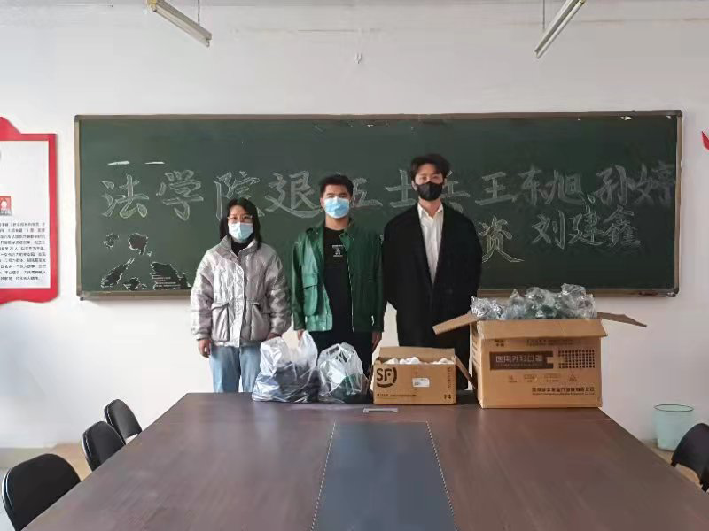 2022年3月30日中午,法学院2021级专升本班退伍士兵王东旭、刘建鑫、孙婷3名同学为学院捐赠了100瓶喷壶和100瓶消毒片,用于学院各寝室消毒防疫。法学院辅导员毕文杰老师参加了捐赠仪式并代表学院接收了捐赠物品。