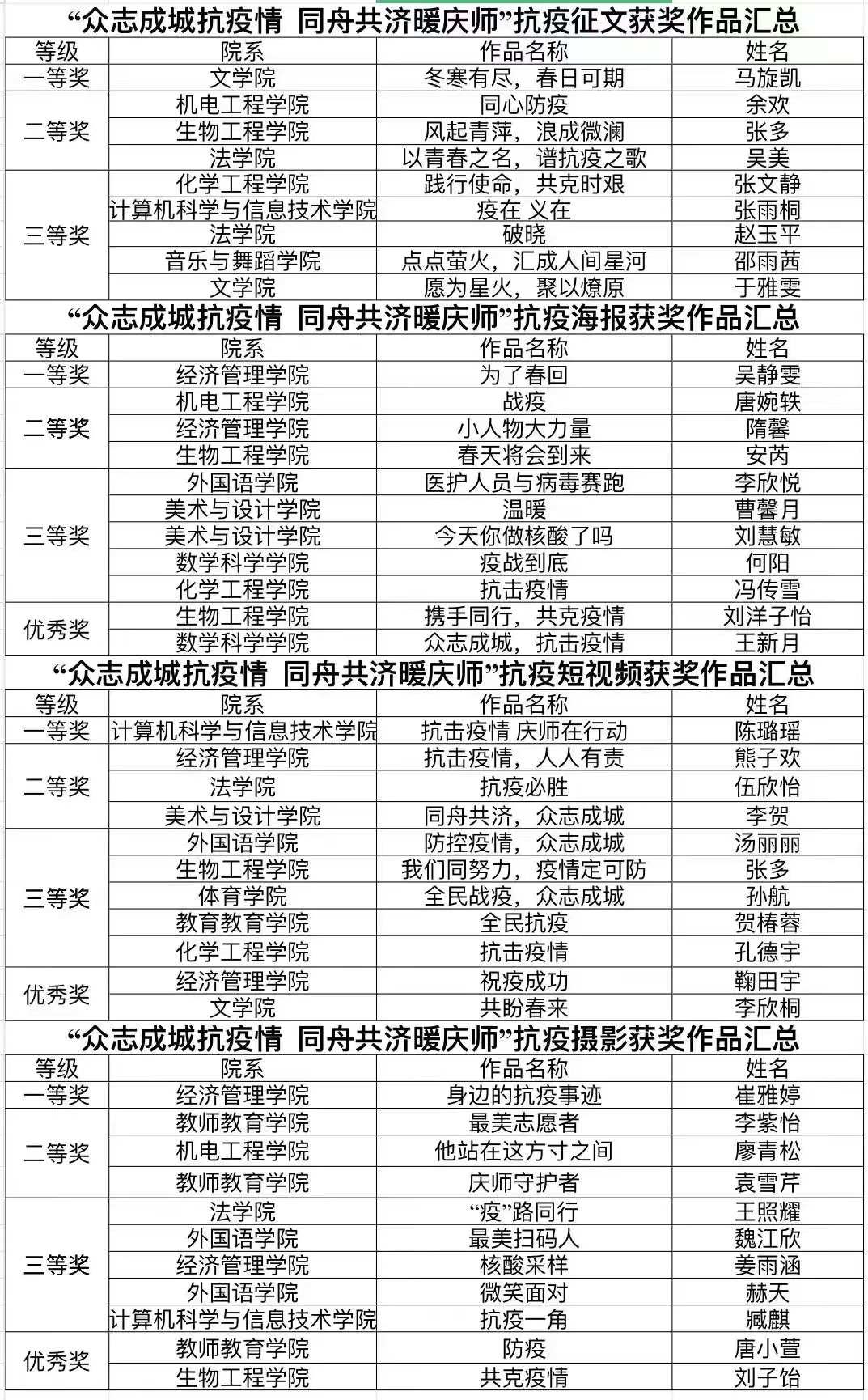 以下是本次“众志成城抗疫情 同舟共济暖庆师”抗疫作品征集活动学生组获奖名单: