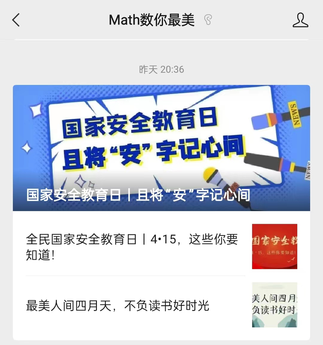 利用学院微信公众号“math数你最美”推出国家安全教育日系列推文,对《国家安全法》及《反恐怖法》等国家安全相关法律法规大力宣传,让广大师生在教育活动中普遍掌握国家安全知识,提升国家安全意识,自觉维护国家安全。