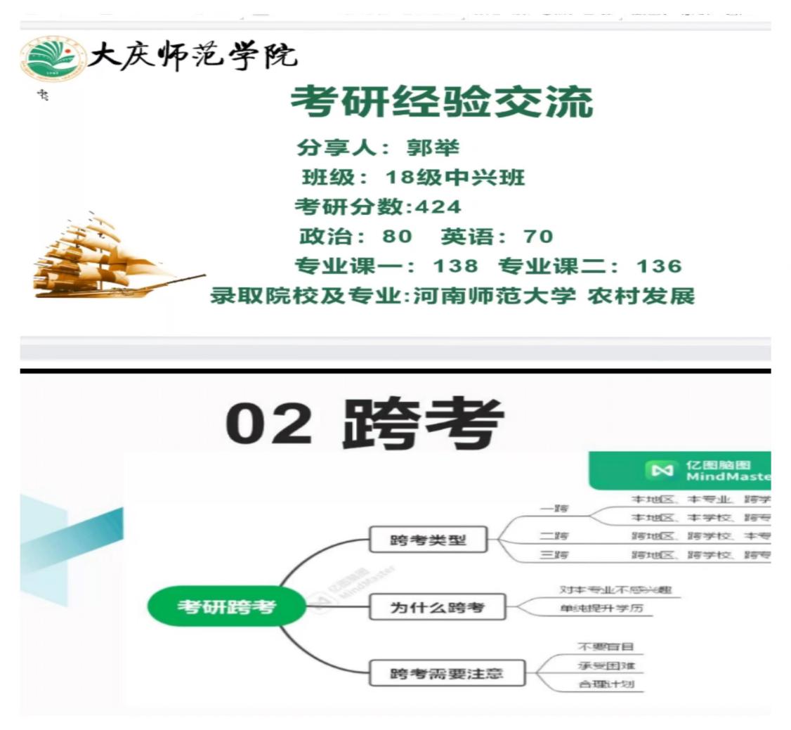 成功上岸的同学分别从复习时间的科学规划、教辅教材的选择、劳逸结合、心态调整、跨专业考研择校及备考的注意事项几个方面做了经验交流分享。