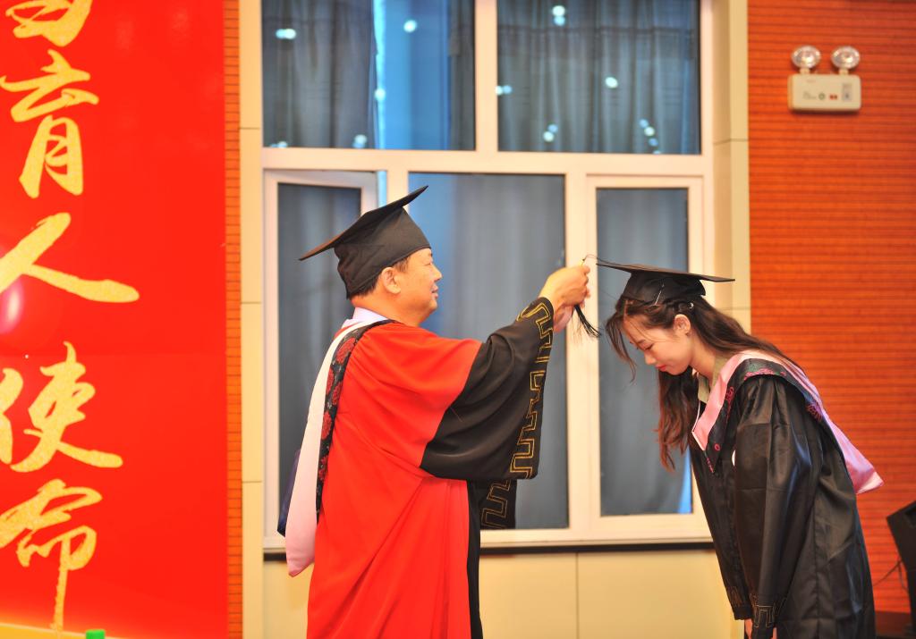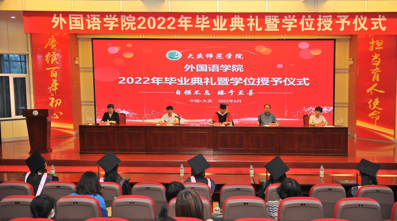 明朝即长路,惜取此时心。6月21日上午,外国语学院2022年毕业典礼暨学士学位授予仪式在学校博雅讲堂举行。学院党政领导班子成员,英语系、商务英语系、翻译系、俄语系、日语系的各位专业老师,学工办的各位辅导员老师,毕业生和在校生代表等出席典礼。此次毕业典礼采取“线上+线下”、师生相聚“云端”的方式,学院专门开通了直播平台,进行现场直播。2022届毕业生,以及学院原学生党支部书记梁为老师,在线上参加毕业典礼。