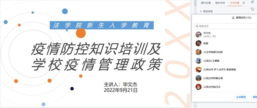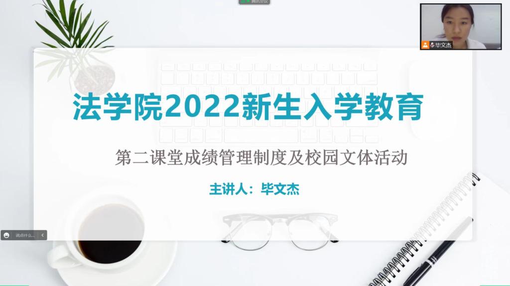 2022年9月11日-25日,法学院通过线上渠道开展了新生入学教育系列活动,本次活动由教学副院长杨庆玲、学生办公室主任张彪、专任教师沈赏、辅导员毕文杰主讲,2022级辅导员毕文杰老师主持。