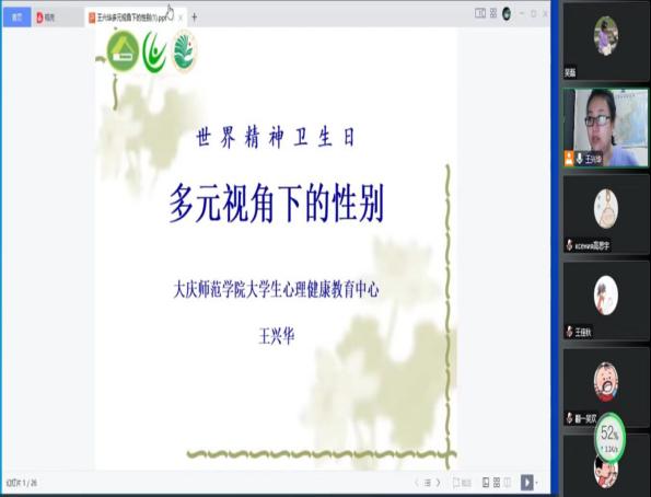 我校大学生心理健康教育中心王兴华老师结合精神卫生日主题和中国计生协青春高校的项目要求,在10月8日通过腾讯会议为全校心理干部开展了“多元视角下的性别”主题讲座。为同学们在身心健康方面提供了多元的视角,帮助学生树立平等、尊重、不歧视的价值观。