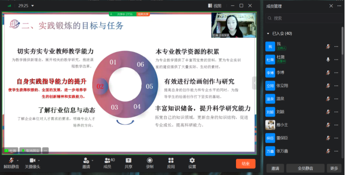 汇报会上,杜薇、陈秀煜、李慧、张立翔、董保臣、王崇娟6位教师分别以PPT形式,结合自己专业实践方向,针对实践单位锻炼学习内容、取得的主要成果和感想体会、对推进教学改革的思考等方面进行汇报。6位教师纷纷表示在实践锻炼过程中要发挥自身专业优势,继续深化实践应用能力,促进艺术创新提高综合素质做合格高校教师。要继续熟悉行业发展形势,坚定学科专业发展自信,提高人才培养质量。