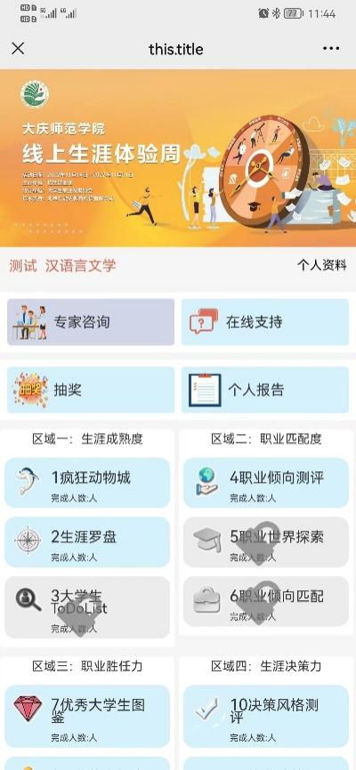 体验周活动分为生涯成熟度、职业匹配度、职业胜任力、生涯决策力、生涯困难诊断五大主题区域,包括疯狂动物城、生涯罗盘等十三个活动关卡。学生在手机端自主参与闯关活动,体验生涯探索过程,完成闯关活动后可以查看个人生涯活动报告,进一步了解自己的个人特质、当前的优势和不足。本次活动特别为学生提供专家线上咨询服务,帮助学生解读个人报告,从而促进学生初步确定短中长期职业规划目标,提高学生自我管理能力,增强就业意识。