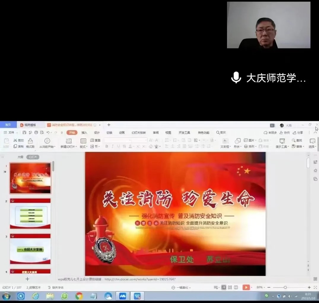 苏立山老师结合丰富的消防安全工作经验,在新年伊始,通过线上讲座对全体2022级全体同学开展消防安全教育,生动的案例讲解、严谨的数据分析、殷殷的告诫引导,熟练消防器材的使用方法,掌握逃生自救的技能,让同学们清醒认识到学习消防安全知识的重要性。