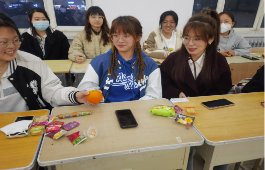 为了拉近同学们彼此的距离,鼓励学生敞开心扉,关老师组织同学们做破冰游戏:击鼓传“橙”。轻松有趣的游戏打破了团体成员间的拘谨,参与成员围坐在一起,随着激烈欢快的音乐响起,两个大橙子在同学们之间飞快地传递起来,当音乐停下来,最后那个拥有“战利品”的同学进行了形式多样的才艺表演:有唱歌、相声等。同学们通过游戏变得相互了解、相互认知,激发了热情,增进了彼此友谊。
