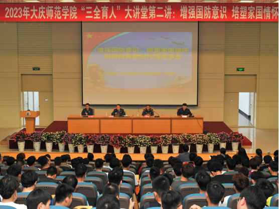 为全面贯彻落实立德树人根本任务,深入推进学校“三全育人”工作,按照《关于进一步深化“三全育人”工作的实施方案》的相关要求,开展“三全育人”大讲堂活动。5月18日下午,“‘三全育人’大讲堂第二讲:增强国防意识 培塑家国情怀”在我校百湖讲堂举行,我校邀请让胡路区人武部上校政治委员董明侠,让胡路区人武部政工科科长梁中宝,让胡路区人武部保障科科长邱悦龙来我校讲学。各学院2019级、2020级学生辅导员及2019级、2020级学生代表参加讲座。