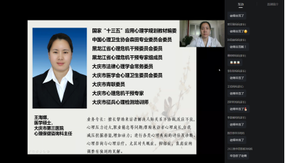 为进一步推进我校心理育人工作,开展了心理健康教育家长课堂,助力家校社医一体化平台建设。6月1日上午9点,邀请大庆市第三医院心理保健咨询科王海娜主任面向我校大一学生家长,开展了“三全育人”大讲堂第四讲“推进家庭教育指导,构建协同心理育人机制”专题讲座。