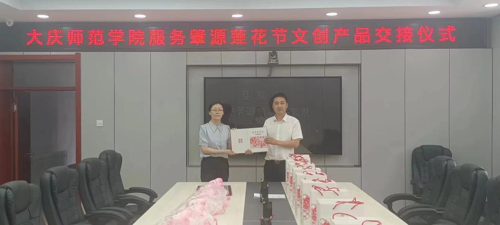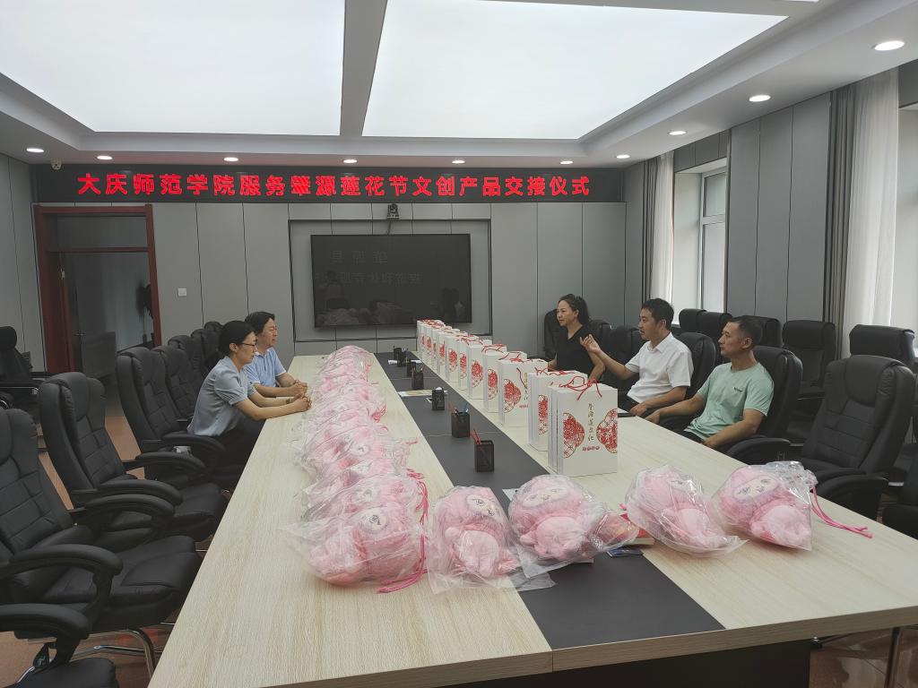 2023年7月18日,美术与设计学院派出五人赴肇源县,参加“莲逢盛世 相约肇源”2023肇源县莲花节。莲花节开幕前肇源县举办了大师范学院服务肇源莲花节文创产品交接仪式,张立翔和孙琦将美术与设计学院为莲花节设计的吉祥物“肇园园”和莲蓬装饰艺术品交给肇源县旅游和体育服务中心主任王嗣玺。本次吉祥物“肇园园”等文创产品设计和制作时间紧,指导教师耿文男亲自赴厂家指导设计,保证了设计吉祥物如期交付,为学院在设计创意方面的深度研究与实践,具有积极的现实意义。