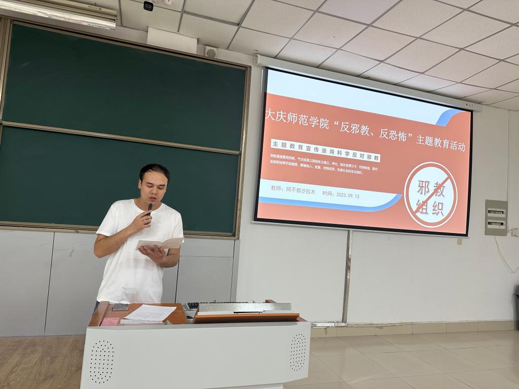 活动中,少数民族辅导员阿不都沙拉木给同学们讲解了什么是邪教和恐怖组织、中华人民共和国反恐怖法以及我国对邪教和恐怖组织的界定,恐怖组织和邪教对社会带来的主要危害,以及如何识别邪教和恐怖组织人员;从五个方面引导学生如何防范和抵御邪教以及如何识别恐怖嫌犯,如果遇到恐怖袭击行为,如何迅速撤离险境保证自身安全等反恐小常识;普及了我国处理邪教的有关法律规定,并详细讲解中华人民共和国反恐怖主义法。