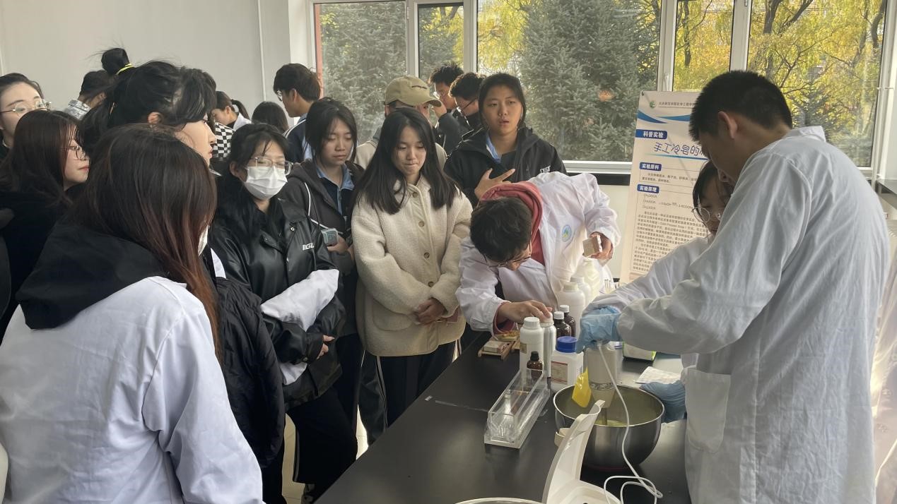 为了让大家更真实地体验到化学中的乐趣,实验教师演示了“水中花园”“一点清”“变化的色彩”“魔术茶水”“冷制手工皂”等富有趣味性和观赏性的小实验,激发起同学们对化学知识、科学知识的兴趣。实验过程中,同学们被神奇的化学现象深深吸引了,纷纷参与进来。通过亲身体验、动手制作,观察实验原理,探求科学知识,同学们分组合作,按操作规程完成实验。