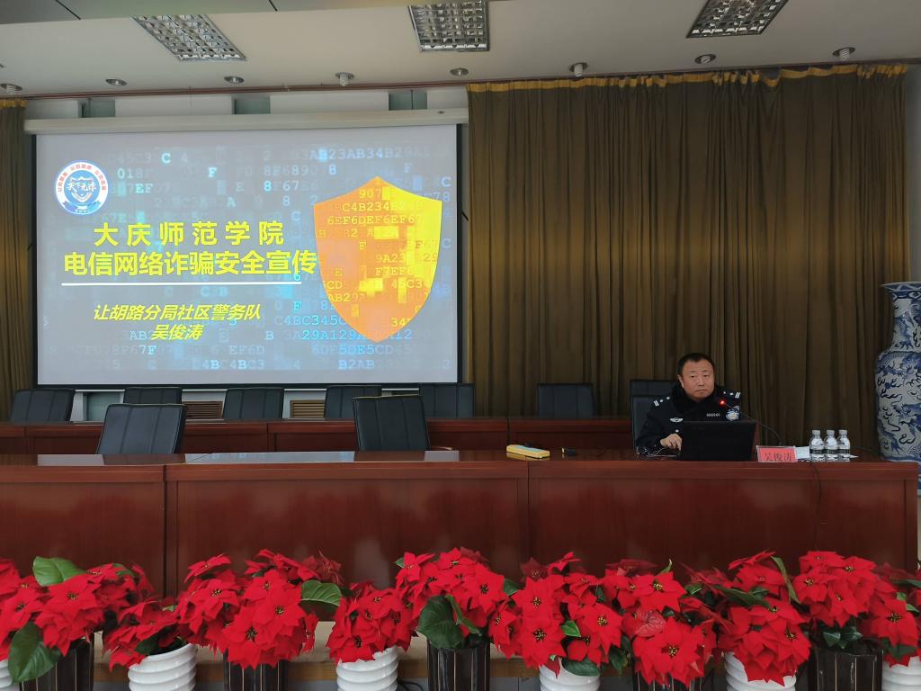近年来,随着互联网的发展,大学生校园诈骗案屡有发生,涉案金额不断增大,部分不法分子利用大学生安全防范意识差等弱点,针对大学生进行电信网络诈骗。为增强广大师生对诈骗风险的防范意识,切实维护师生的合法权益,11月15日下午,我校在铁人讲堂举行防范电信网络诈骗专题讲座,对师生进行法治安全宣传教育。此次讲座特邀请大庆市让胡路区公安局吴俊涛警官担任主讲,我校辅导员、学生代表及学生处相关人员参加了此次讲座。