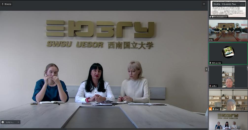 俄方副校长Pakhomova Ekaterina Gennadievna介绍了俄罗斯西南国立大学的整体情况,同时还向我校发出邀请,希望我校领导参加西南国立大学2024年5月举办的六十周年校庆。预科院主任 Brekhova Marina Yurievna介绍了西南国立大学外国留学生招收培养情况,希望在师资能力学历提升等项目上开展新的合作。