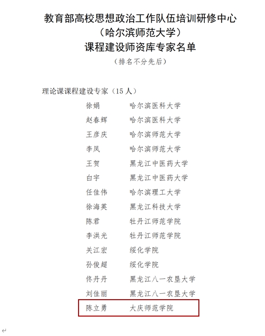 近日,教育部高校思想政治工作队伍培训研修中心(哈尔滨师范大学)公布了课程建设师资库专家名单,我校马克思主义学院教授、大庆精神研究基地主任陈立勇获聘理论课课程建设专家。