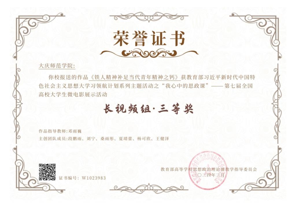 根据《教育部办公厅关于开展习近平新时代中国特色社会主义思想大学习领航计划主题教育活动的通知》(教社科厅函〔2023〕14号)精神,2024年2月由教育部高校思政课教学指导委员会主办的“我心中的思政课”第七届全国高校大学生微电影展示活动经过多轮评审和多学科专家评审,评选结果揭晓。由我校邓雨巍教授指导,机电工程学院、文学院学生创作报送的微电影作品《铁人精神补足当代青年精神之钙》荣获长视频组全国三等奖。习近平新时代中国特色社会主义思想大学习领航计划系列主题活动,旨在引导大学生深化对思政课教学内容的认识和思考,展现新时代大学生的马克思主义理论素养和精神风貌。
