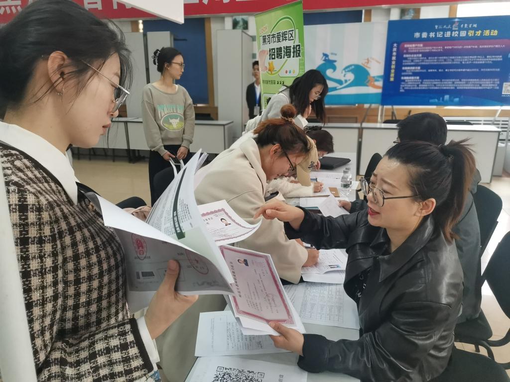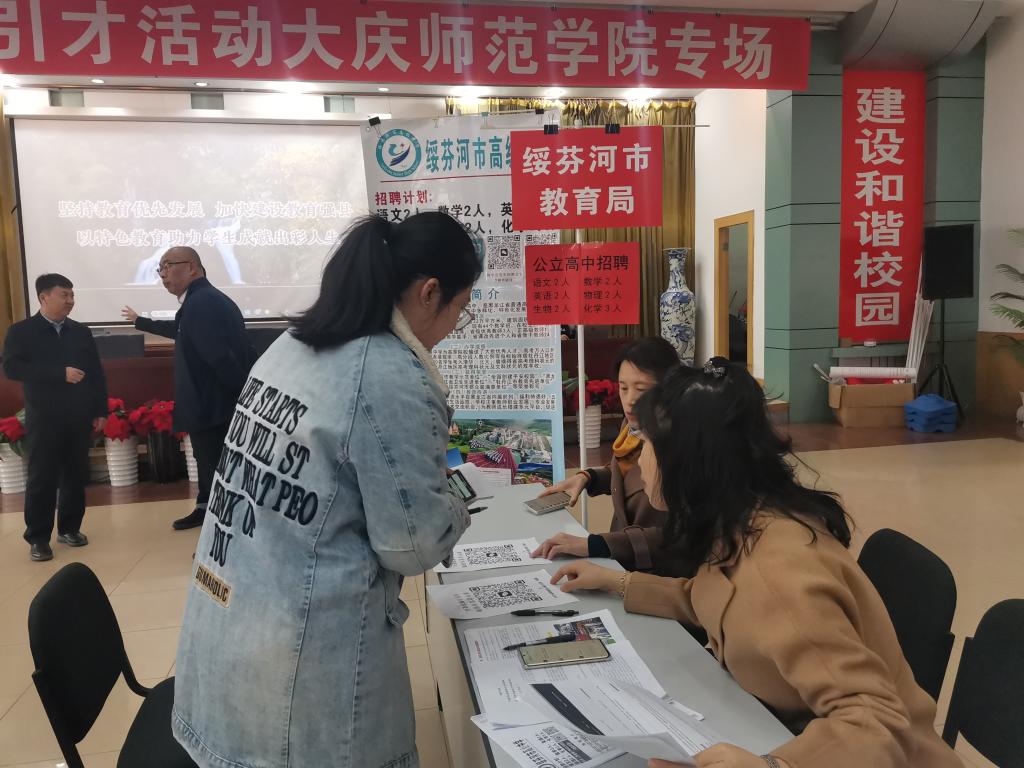 来自黑河市爱辉区、伊春市嘉荫县、牡丹江市绥芬河市、鹤岗市绥滨县四地教育局带队参加活动,提供各学科教师岗位50余个,100余名本校和省内高校师范类毕业生到现场咨询岗位,投递简历。其中不乏生源来自这些市县的学生,他们表示希望回到家乡,助力家乡教育发展。
