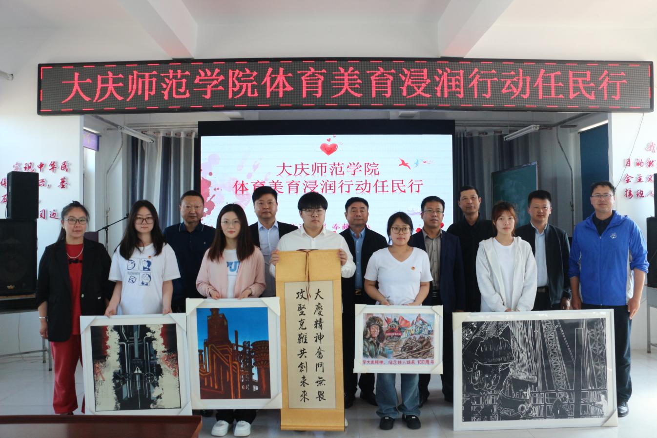 6月4日,教务处、团委组织美术与设计学院、体育学院师生赴安达市任民镇中心校开展体育美育浸润及学生社团活动。美术与设计学院师生向任民镇中心校赠送学生书画作品,并开展《铁人连环画》宣讲,带领学生学习大庆精神(铁人精神)。